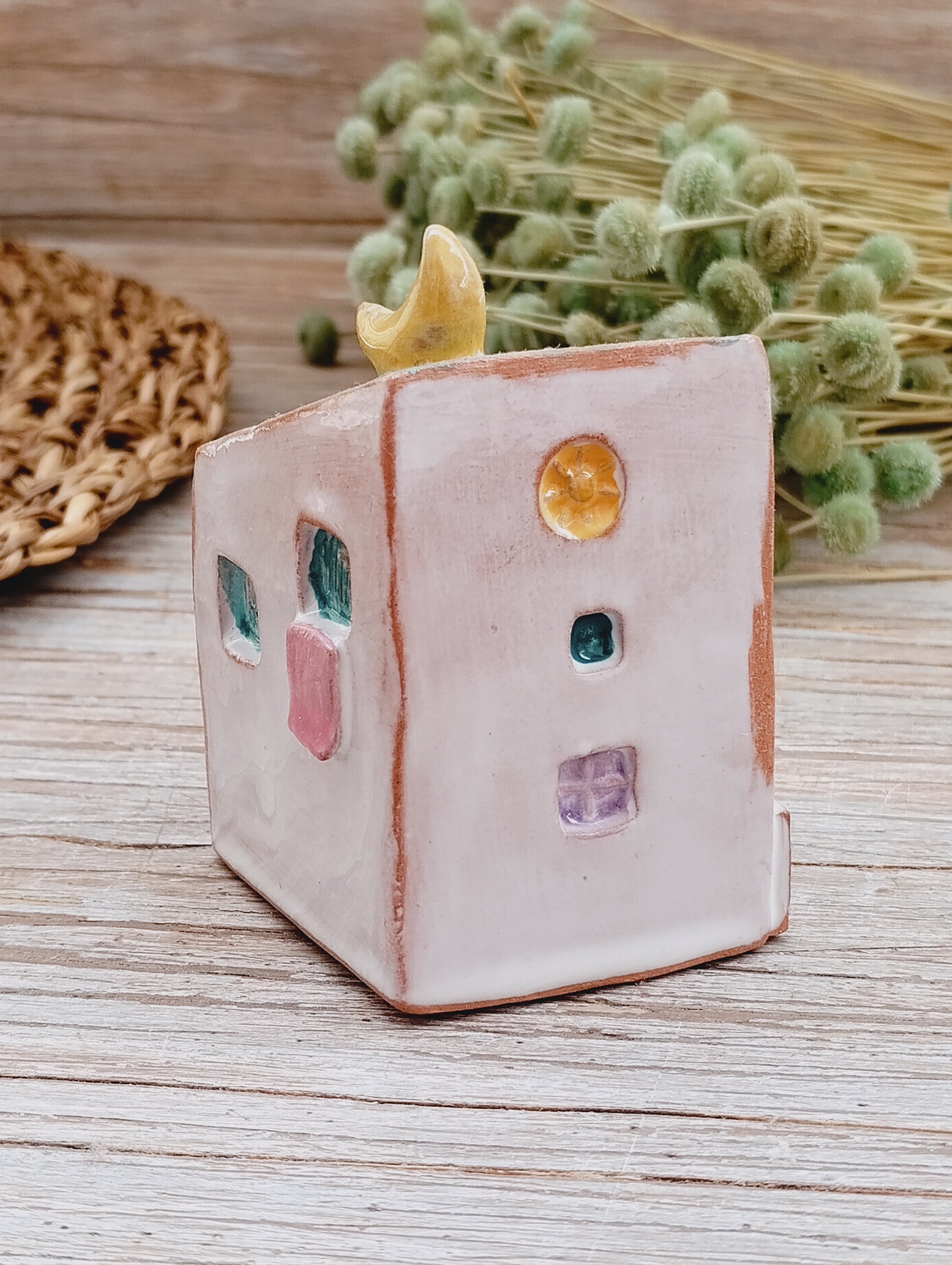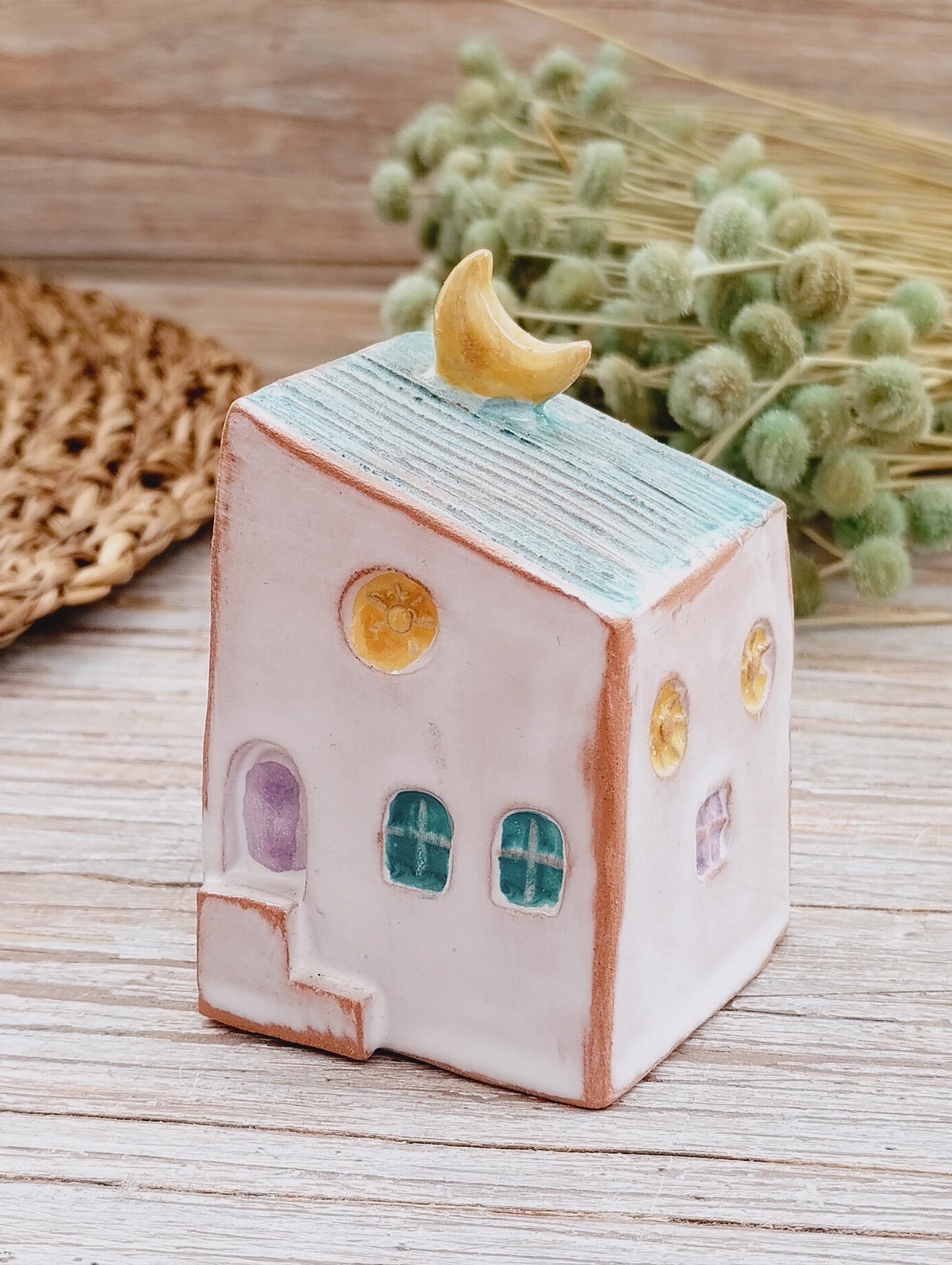 Casetta in miniatura in ceramica, ricca di dettagli e decorata da tutti i lati.