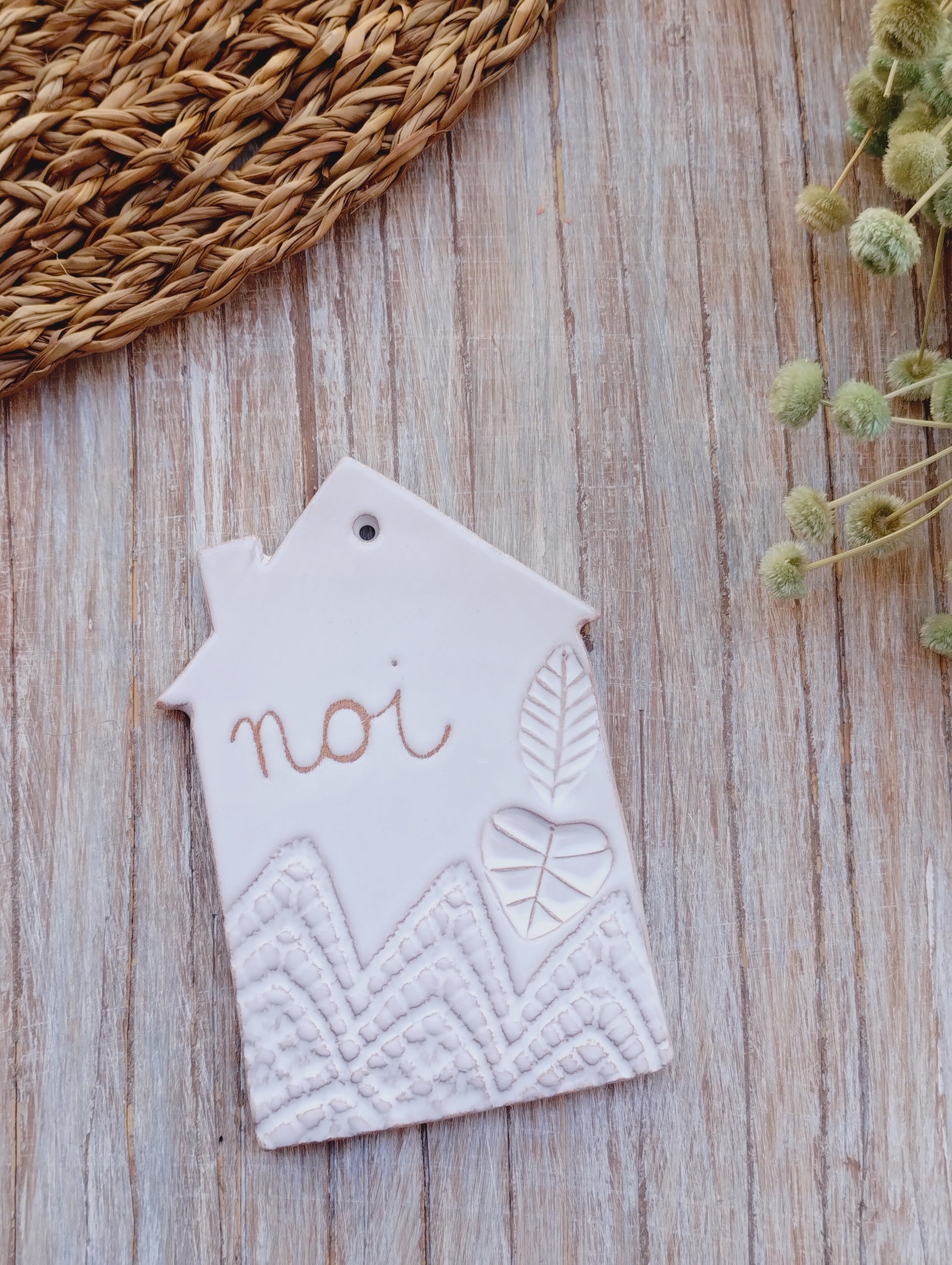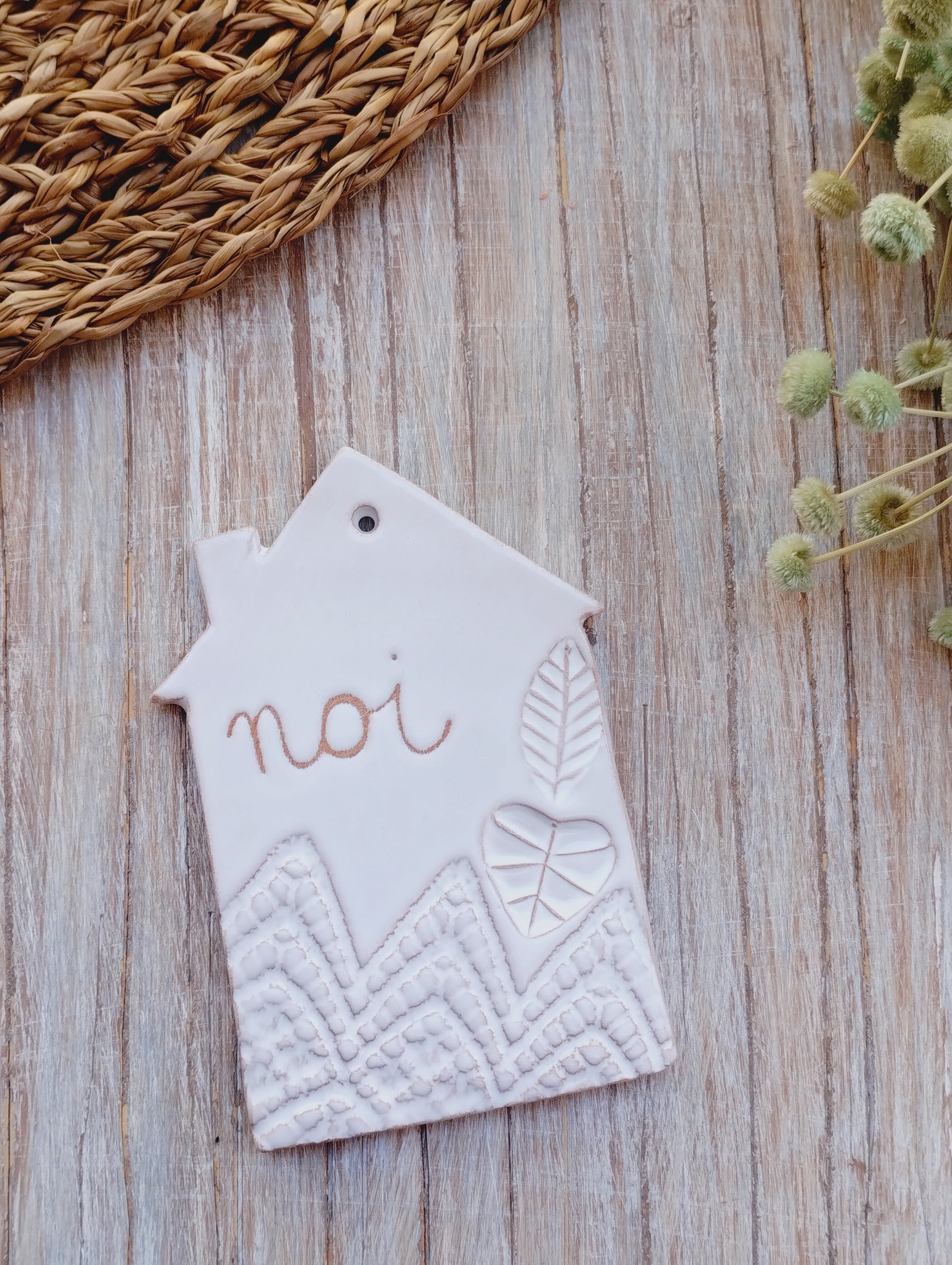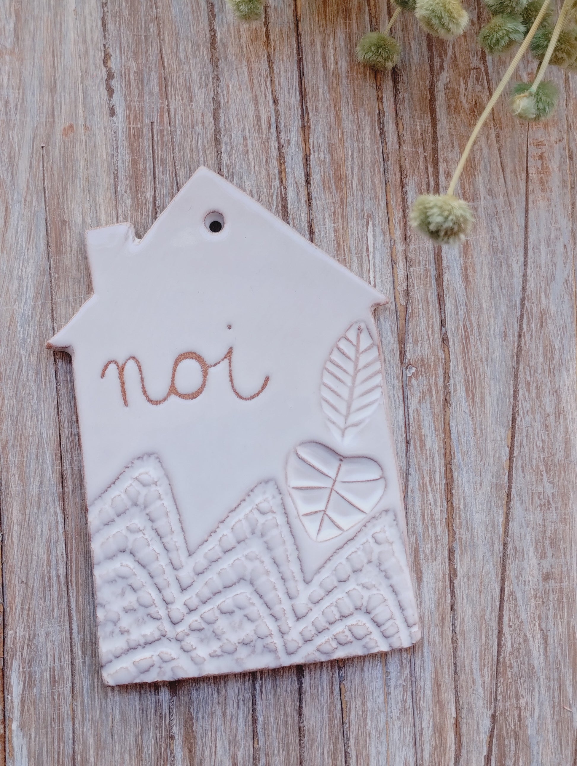 Casetta in ceramica con foglie impresse, effetto merletto e scritta "noi" è fornita di foro per essere appesa.