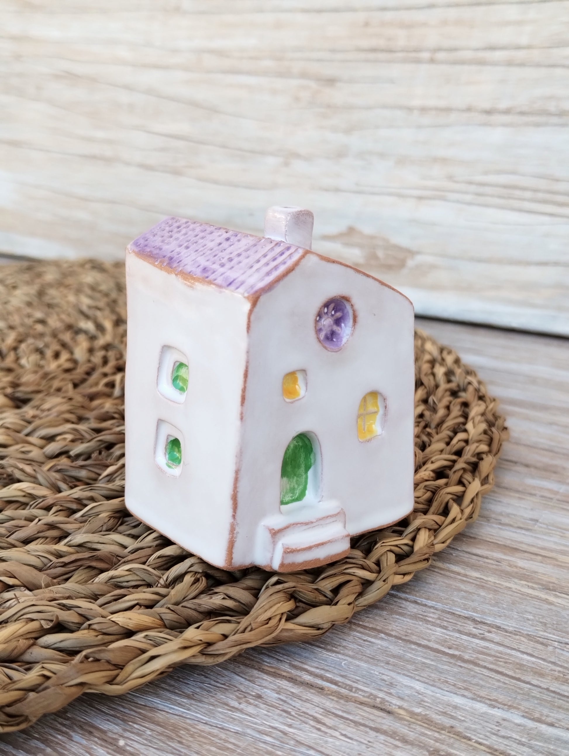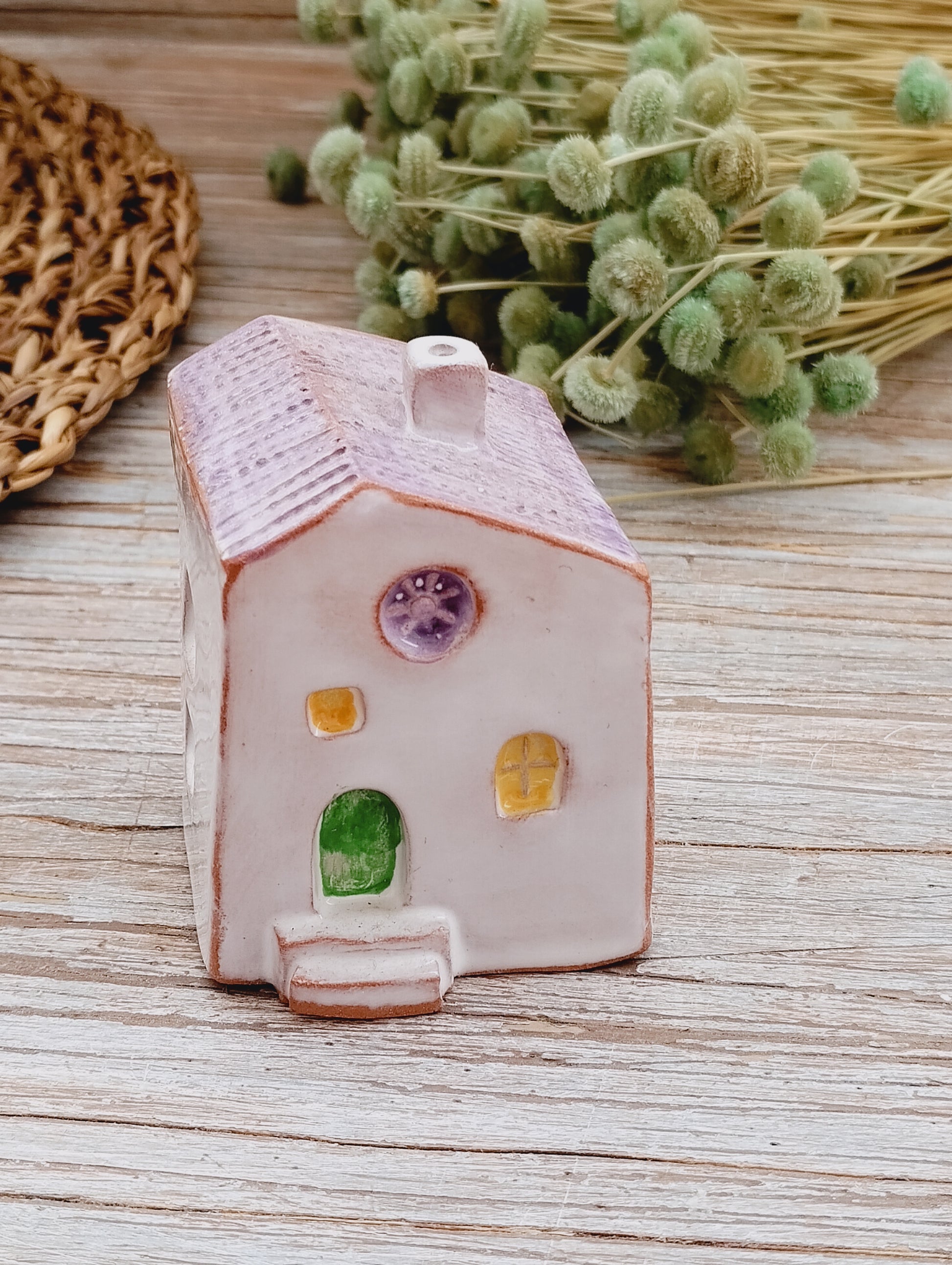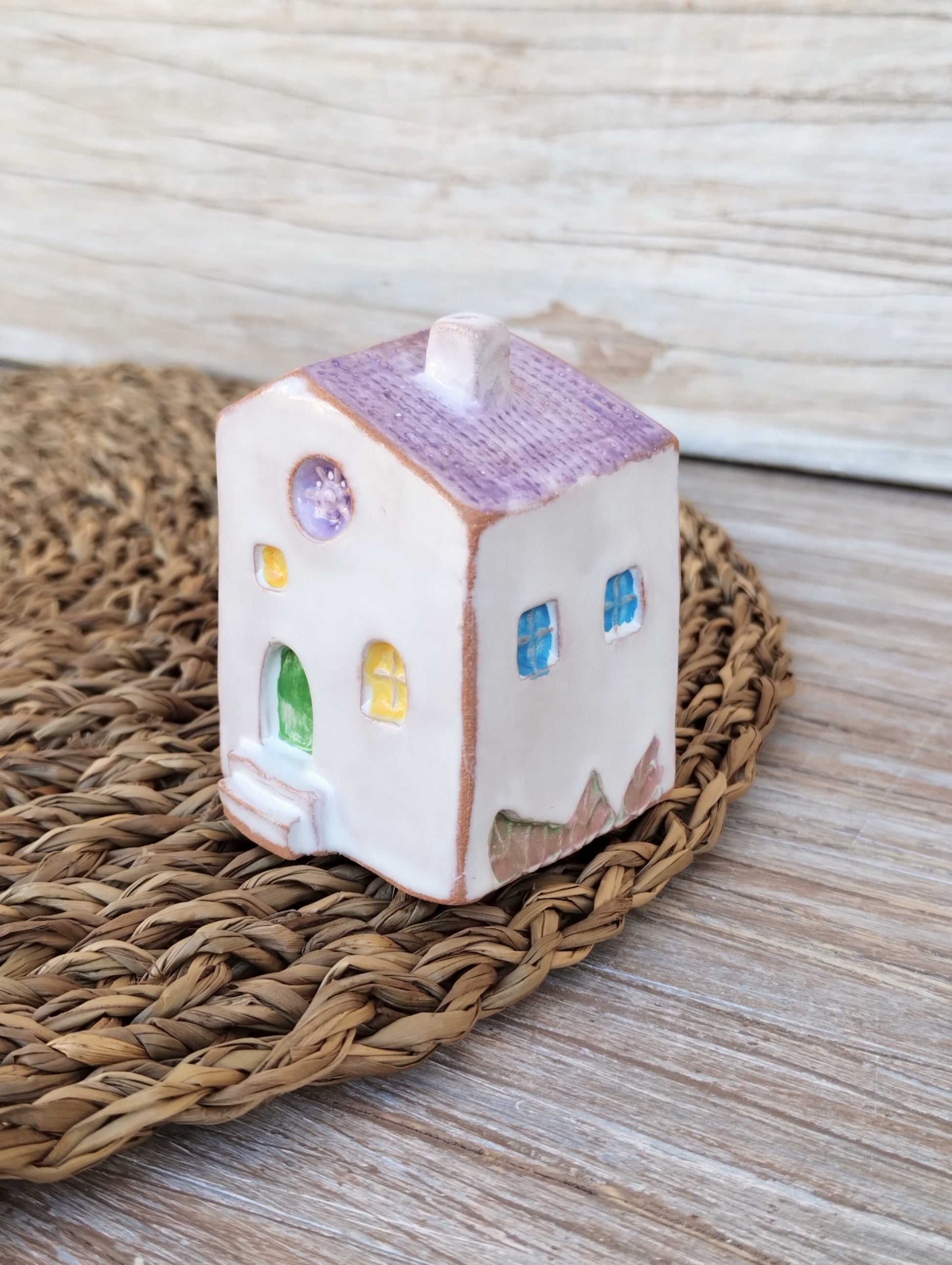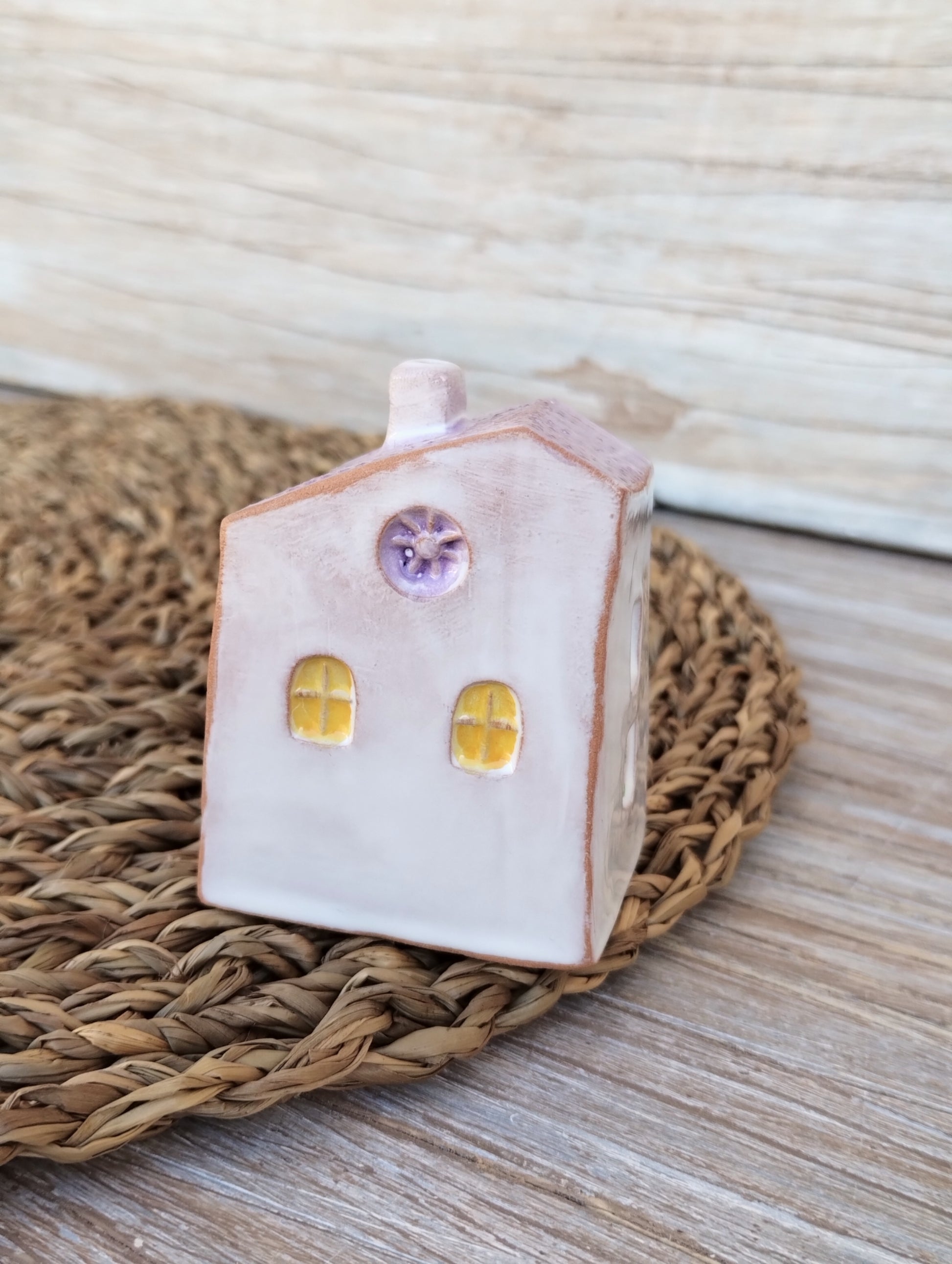 Casetta in miniatura in ceramica, ricca di dettagli e decorata da tutti i lati.