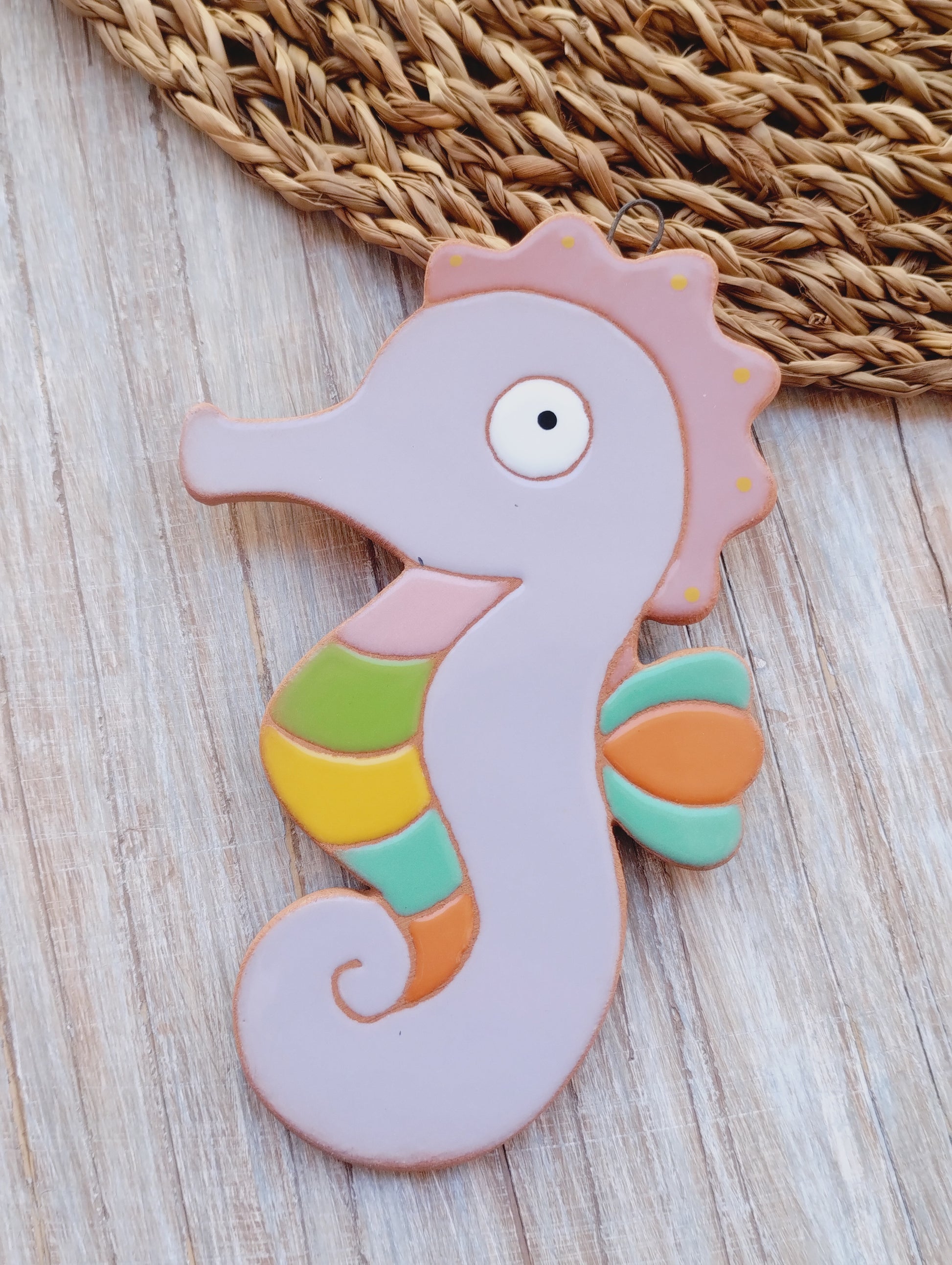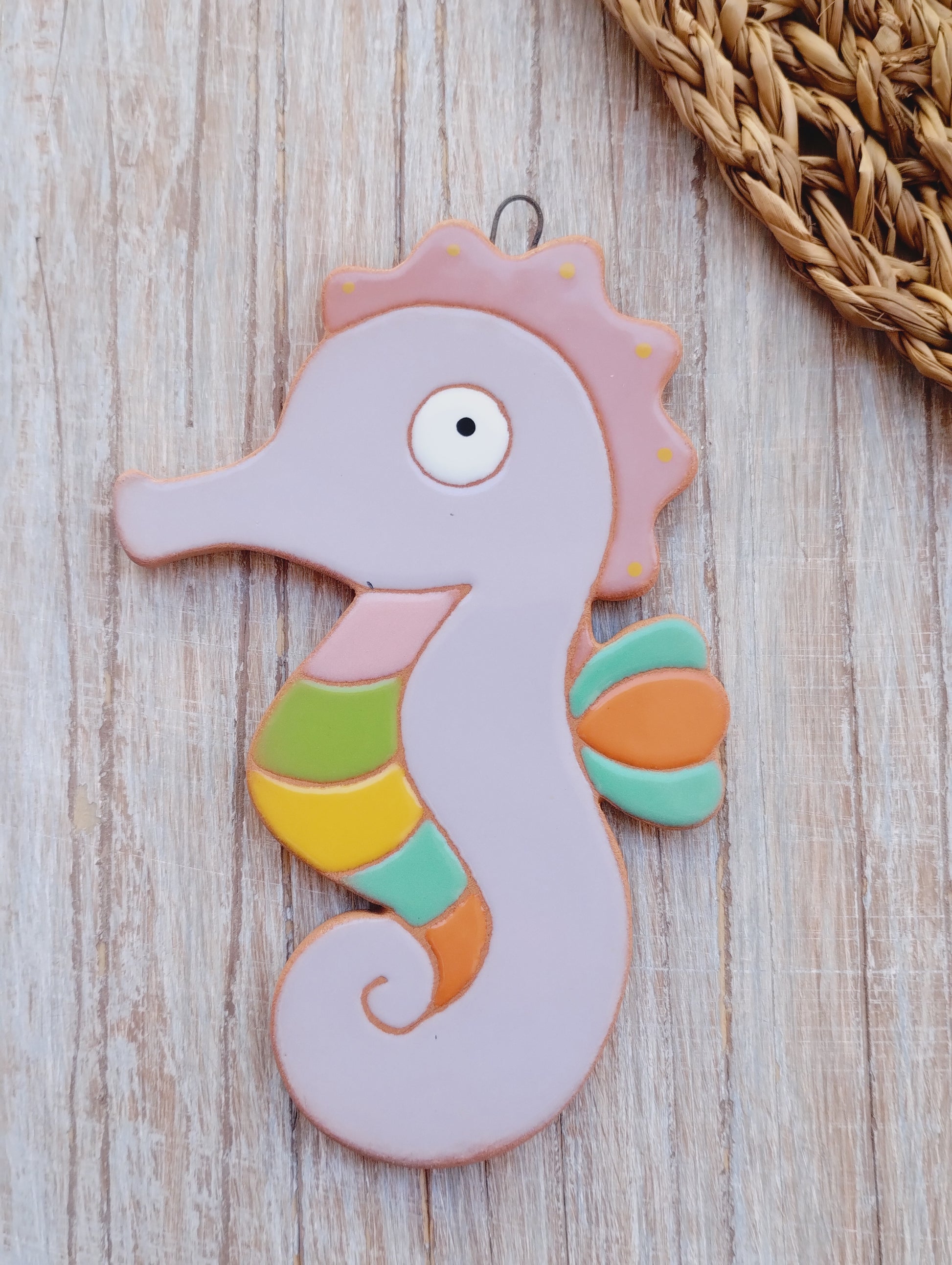 Cavalluccio marino in ceramica decorato con la tecnica della cuerda seca, è fornito di gancio per essere appeso.