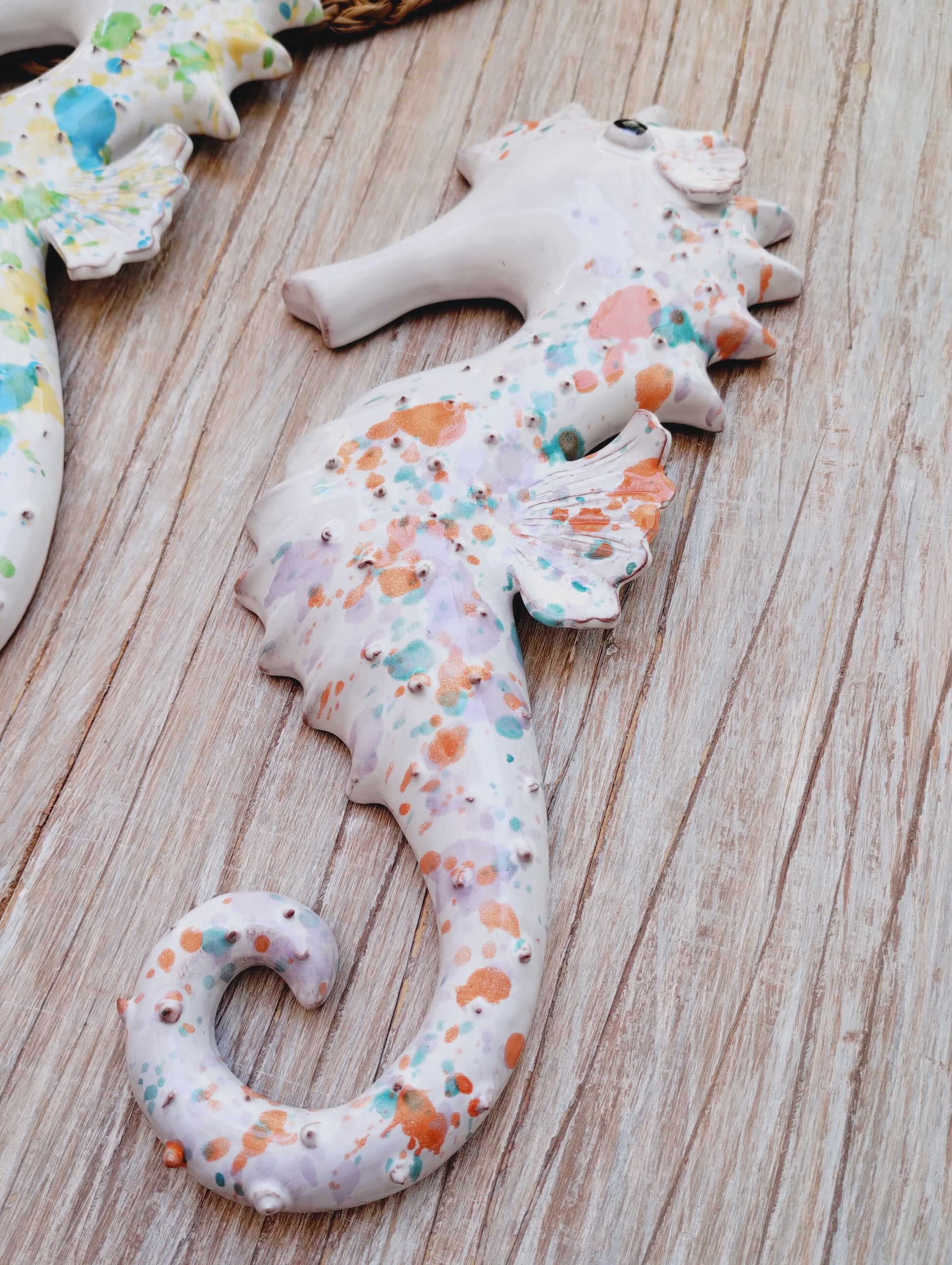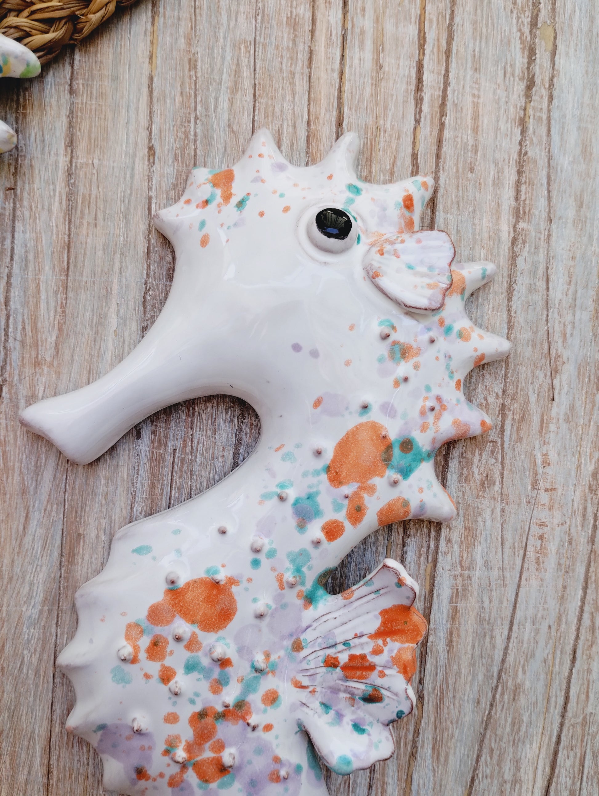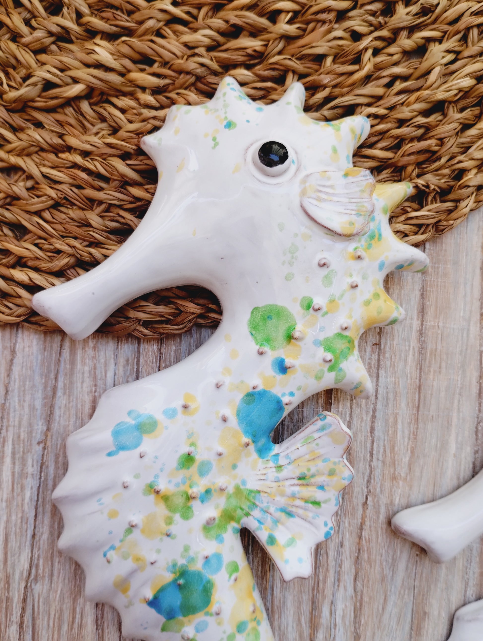 Cavalluccio marino in ceramica da appendere, effetto schizzi di colore.
