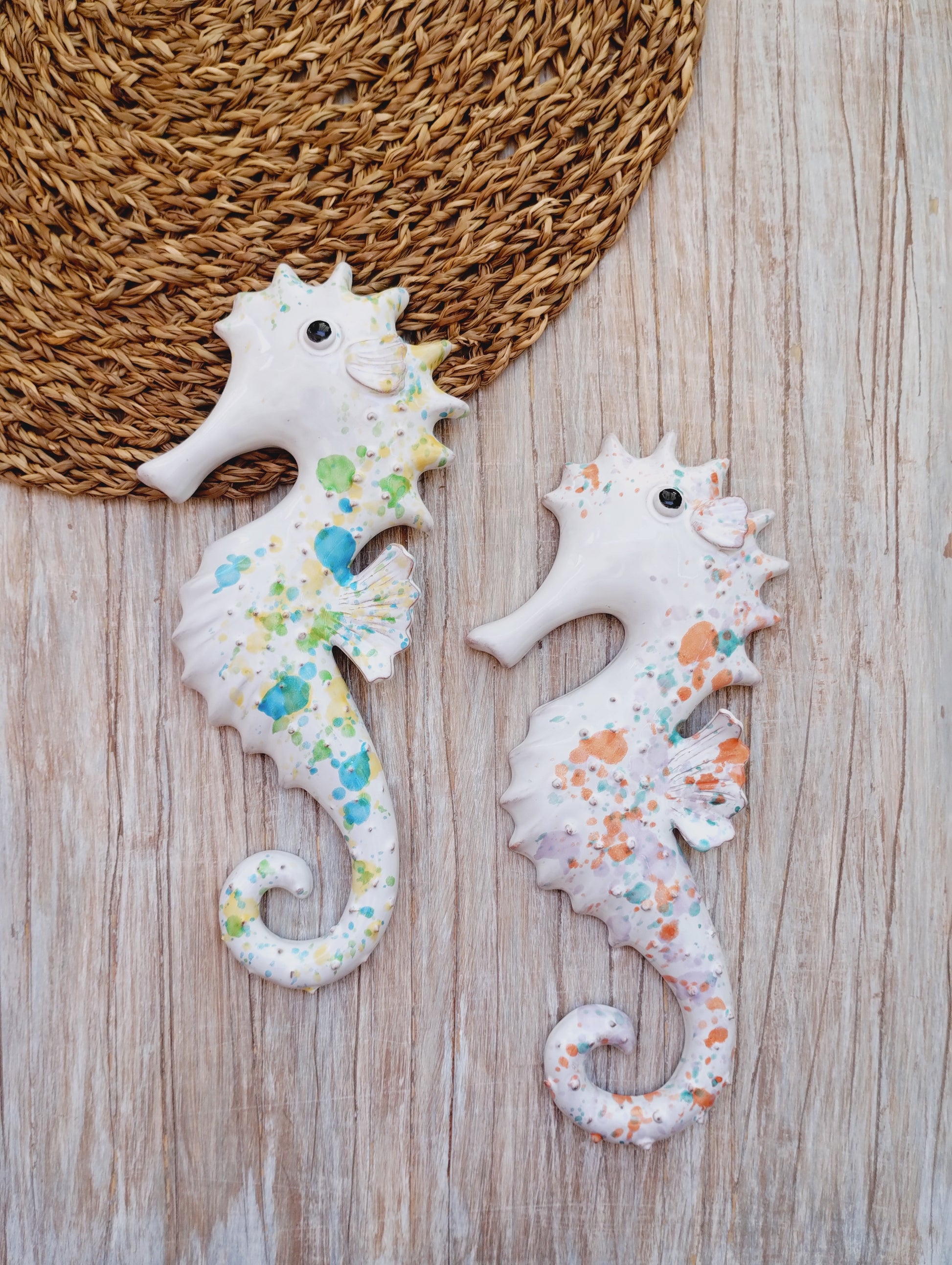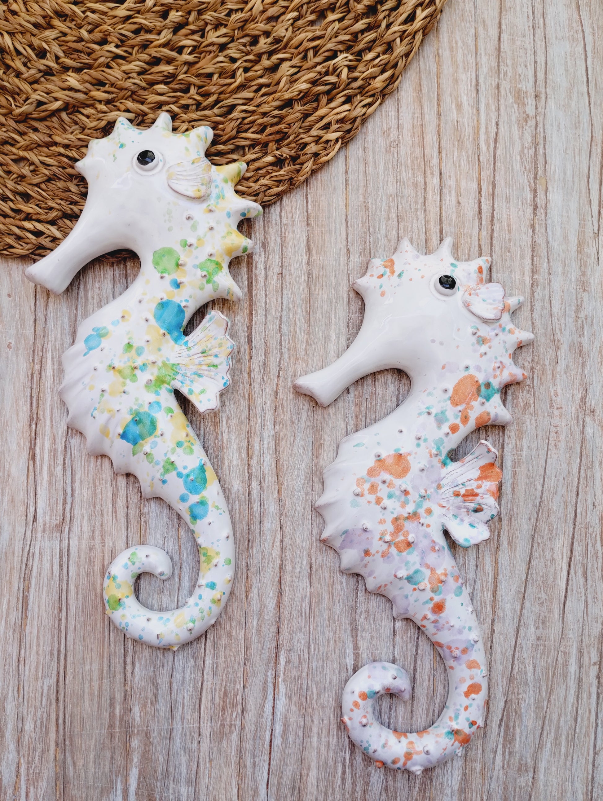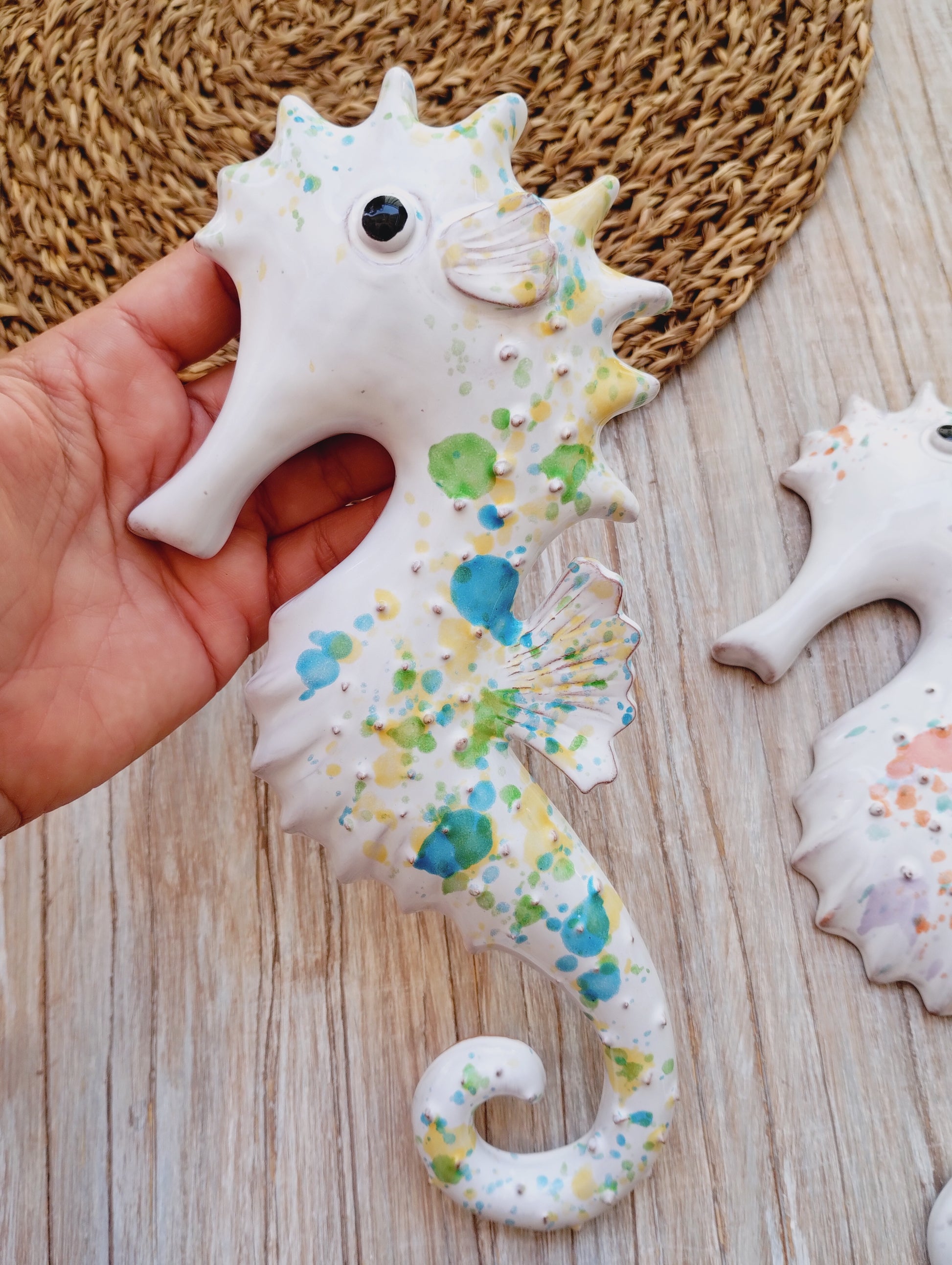Cavalluccio marino in ceramica da appendere, effetto schizzi di colore.