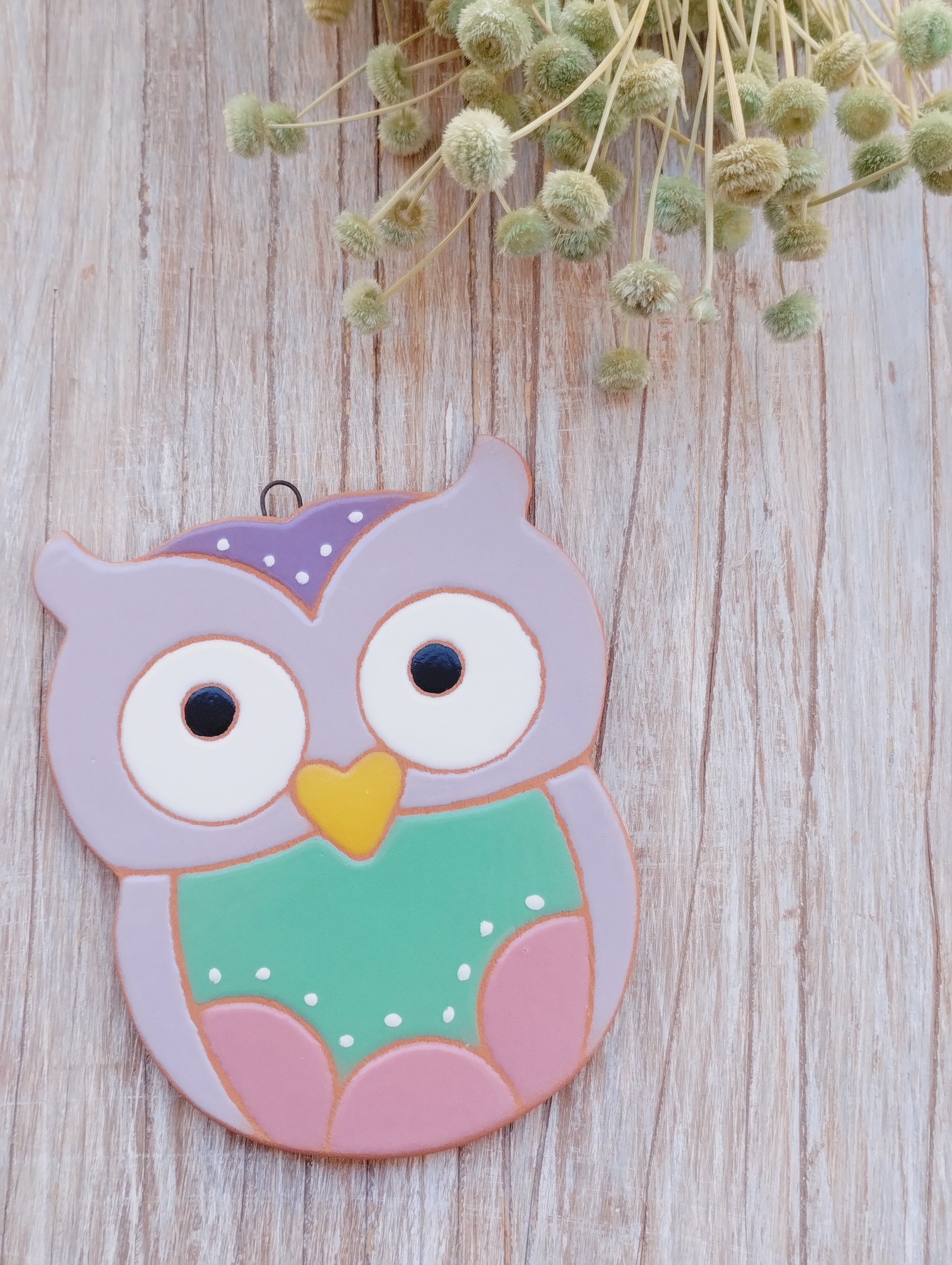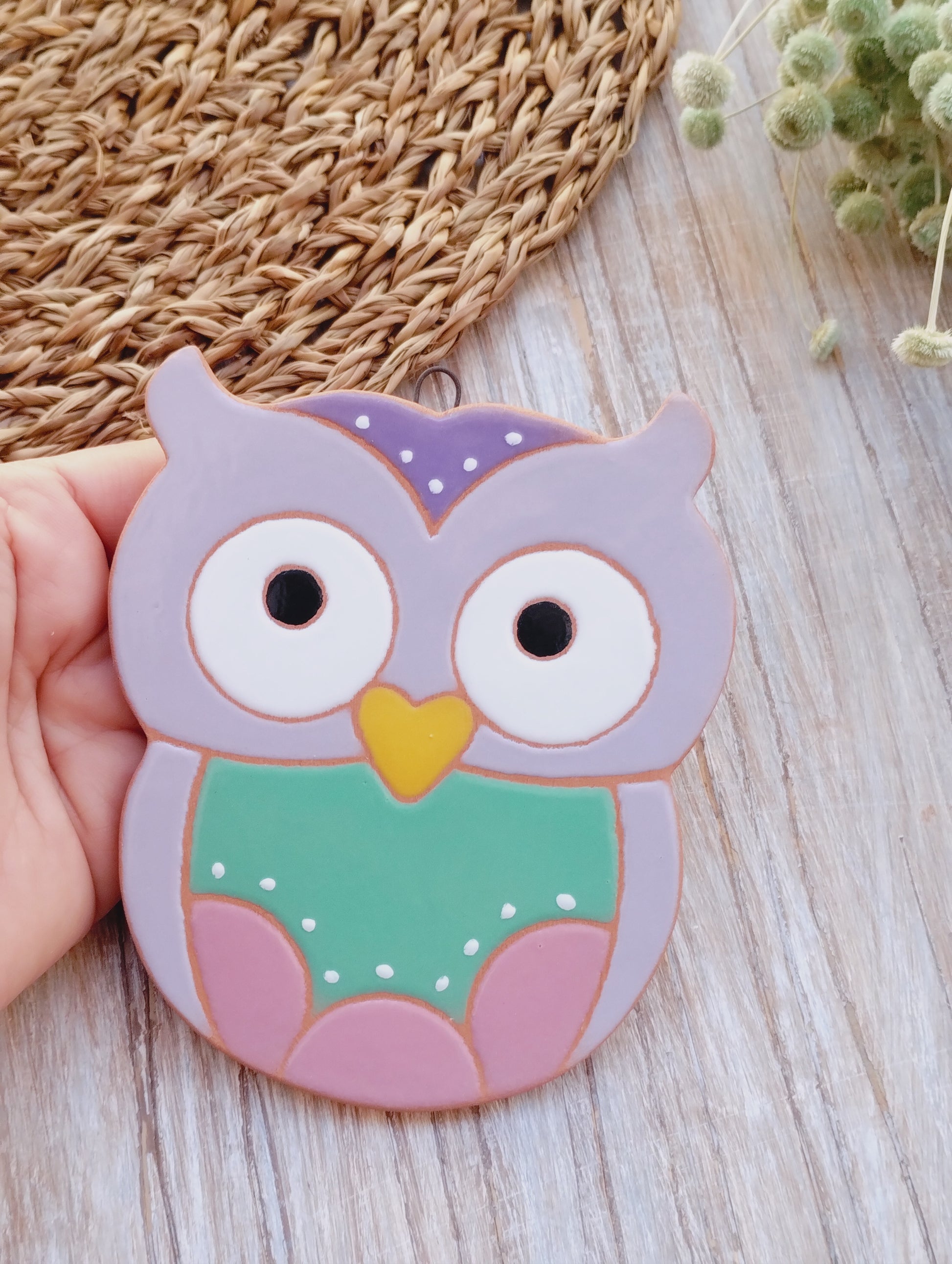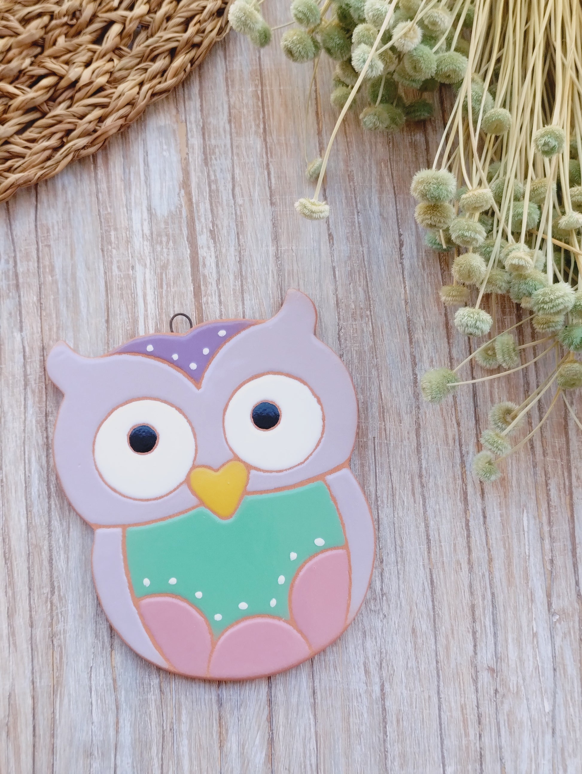Gufetto in ceramica decorato con la tecnica della cuerda seca, è fornito di gancio per essere appeso ed è un pezzo unico.
