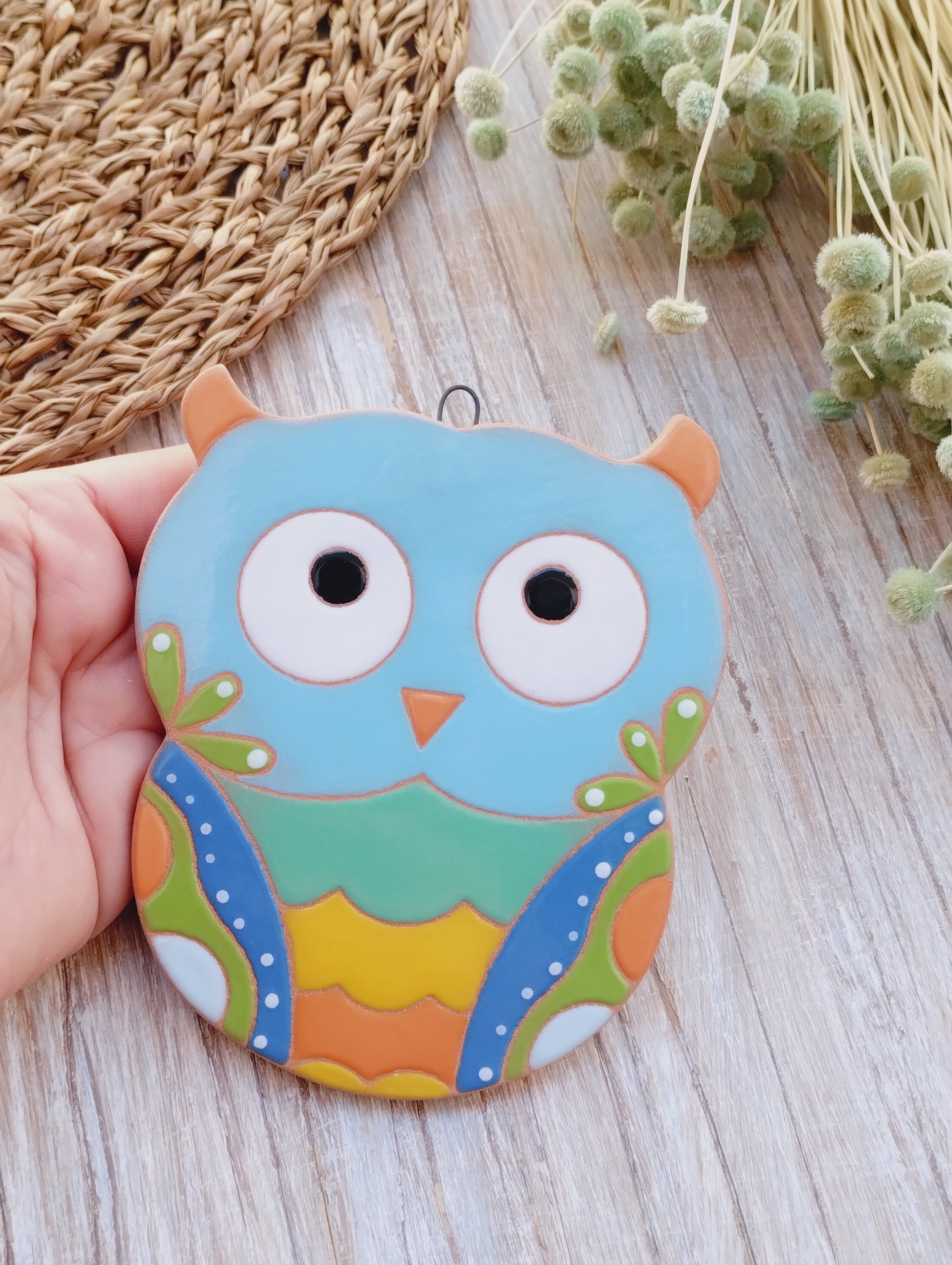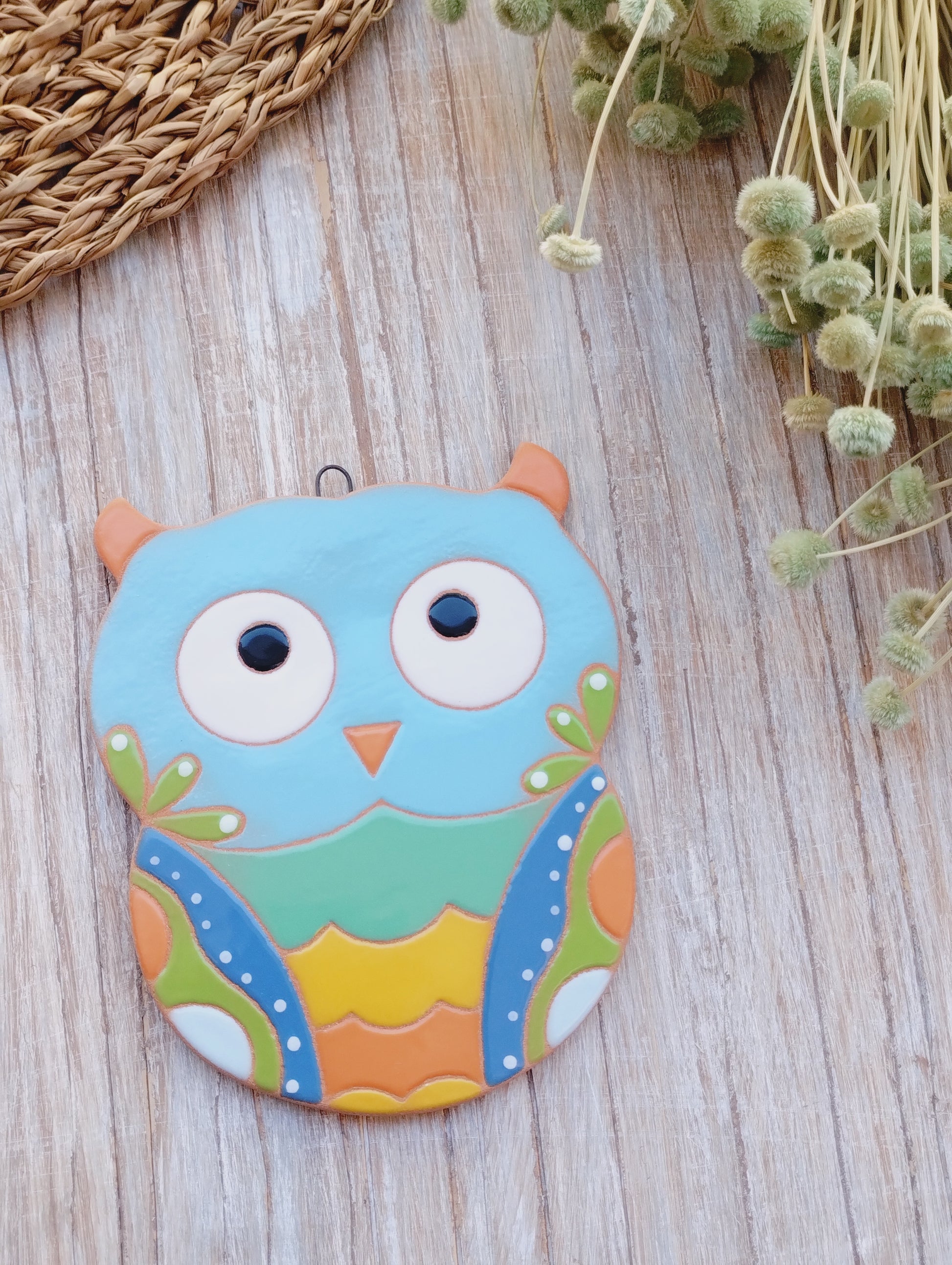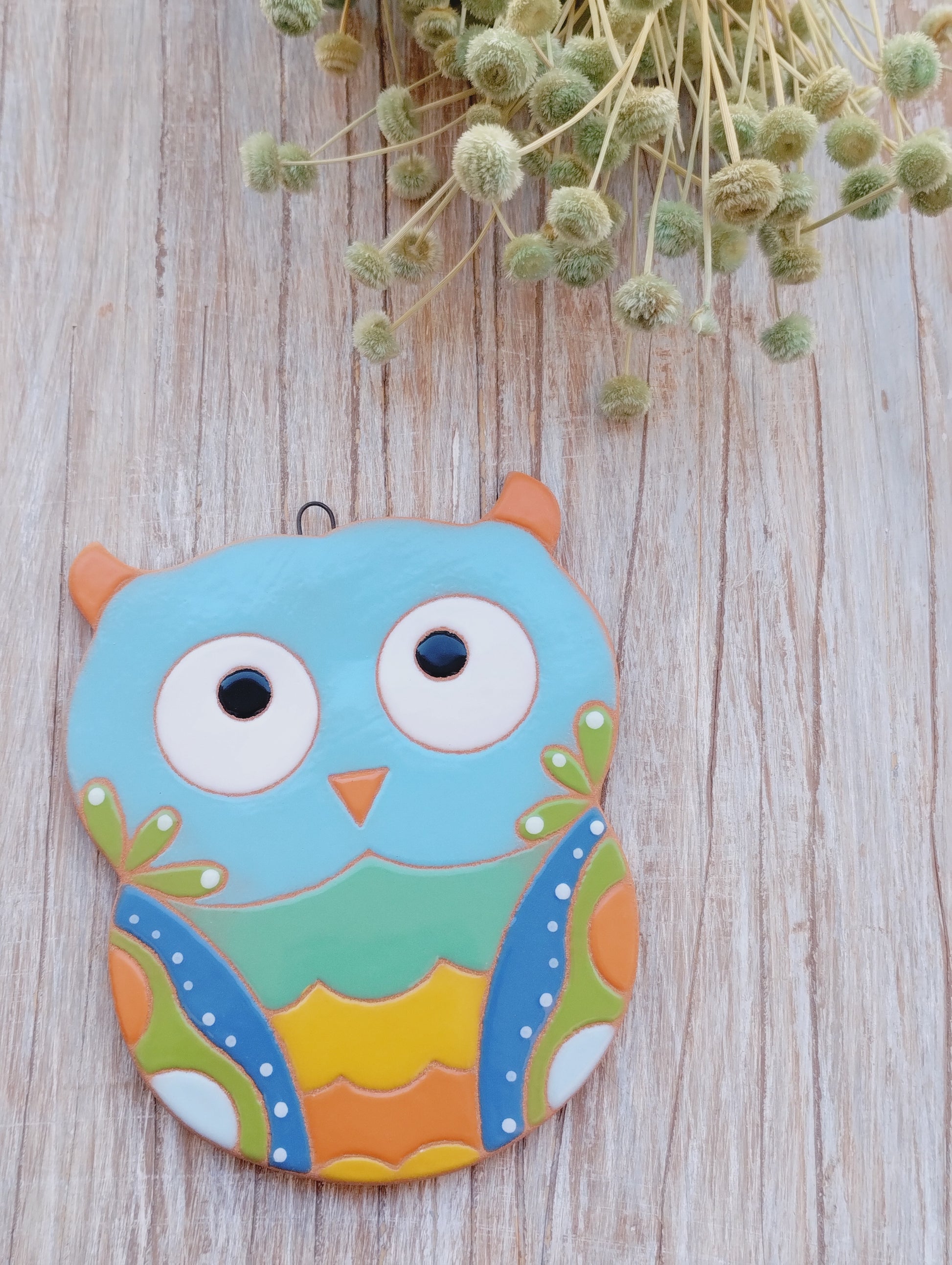 Gufetto in ceramica decorato con la tecnica della cuerda seca, è fornito di gancio per essere appeso ed è un pezzo unico.