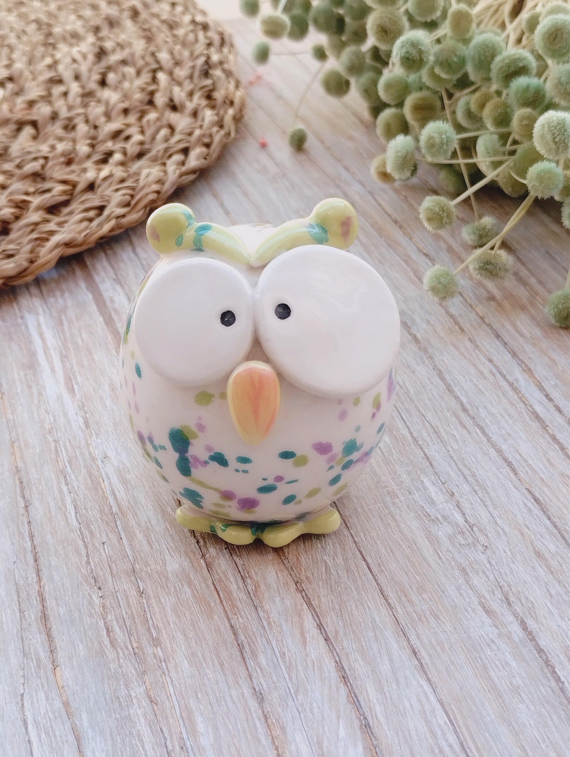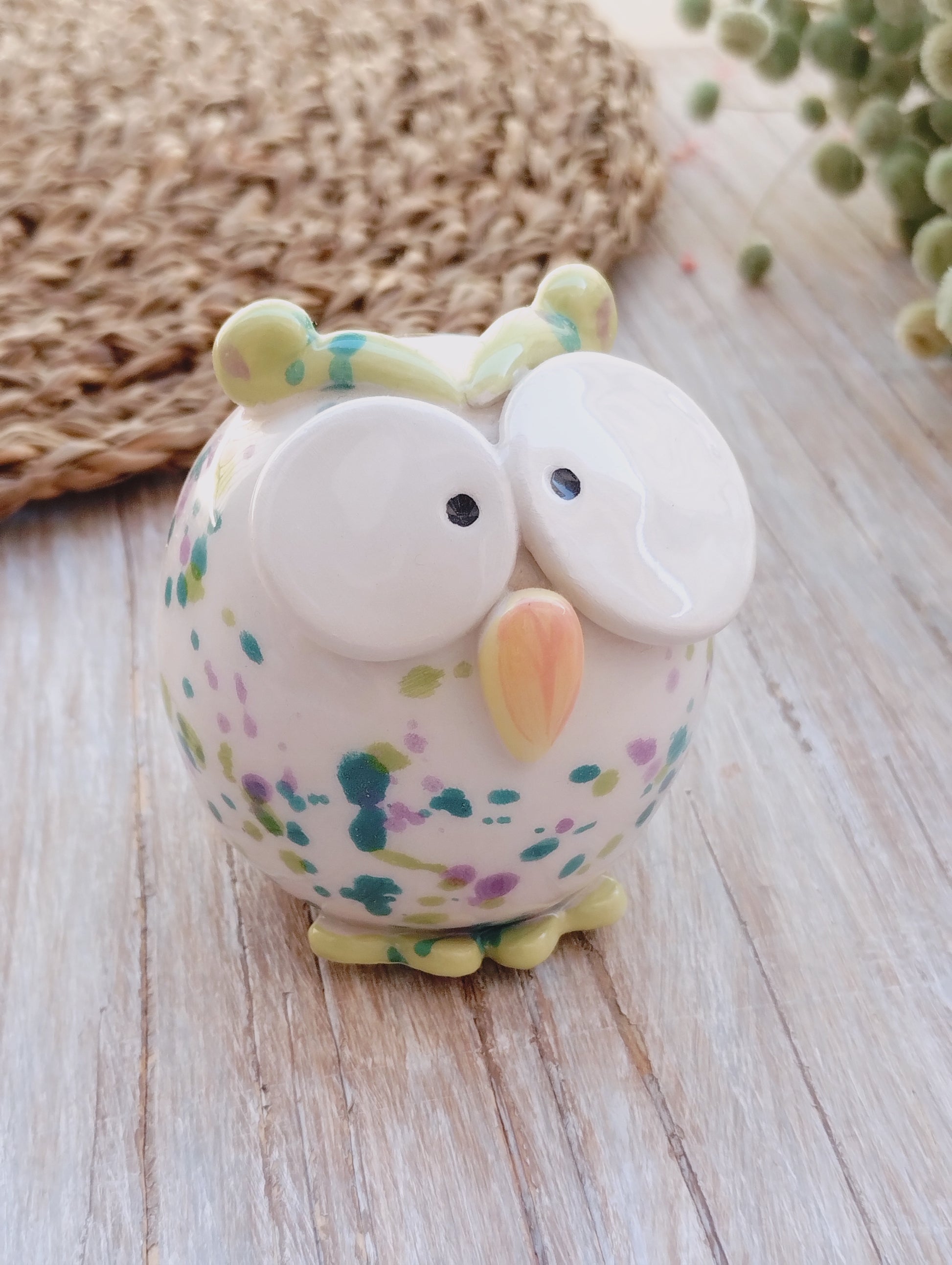 Gufetto in ceramica bianca e decorazione effetto schizzo.