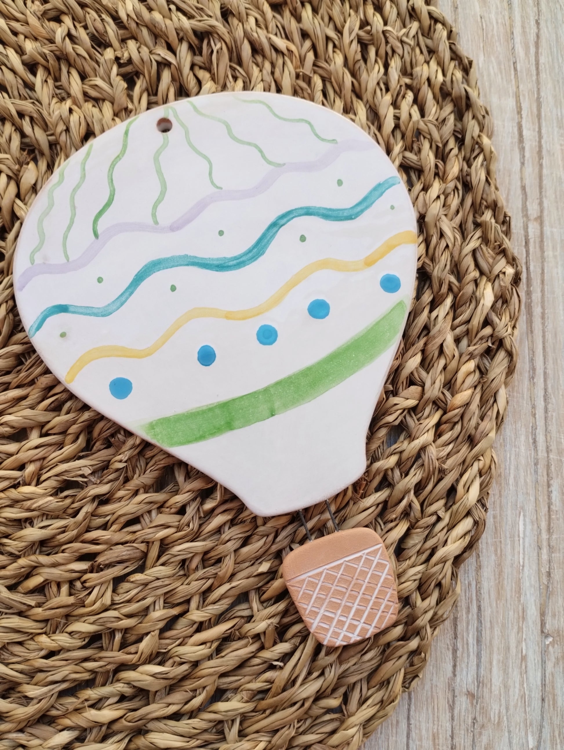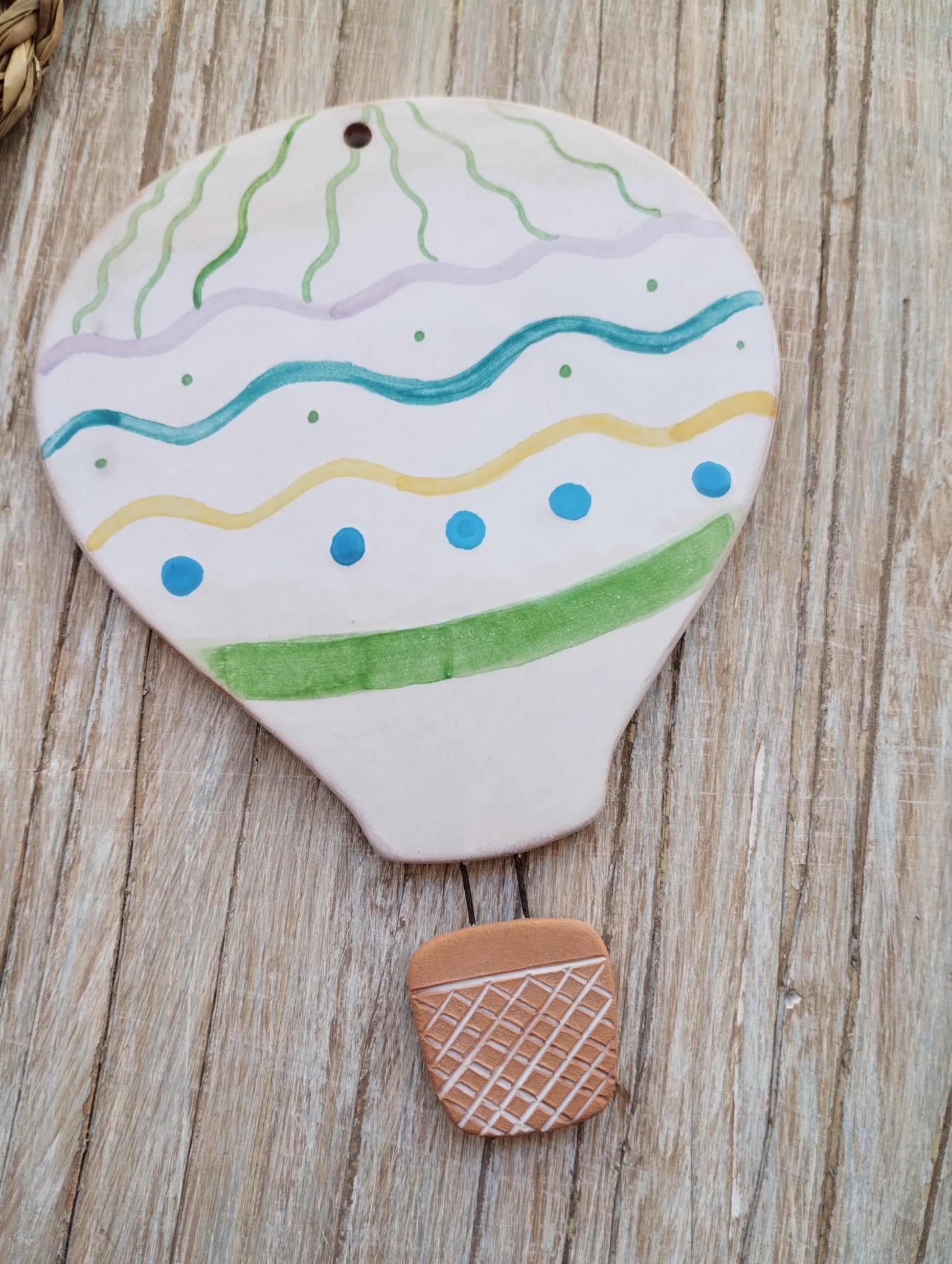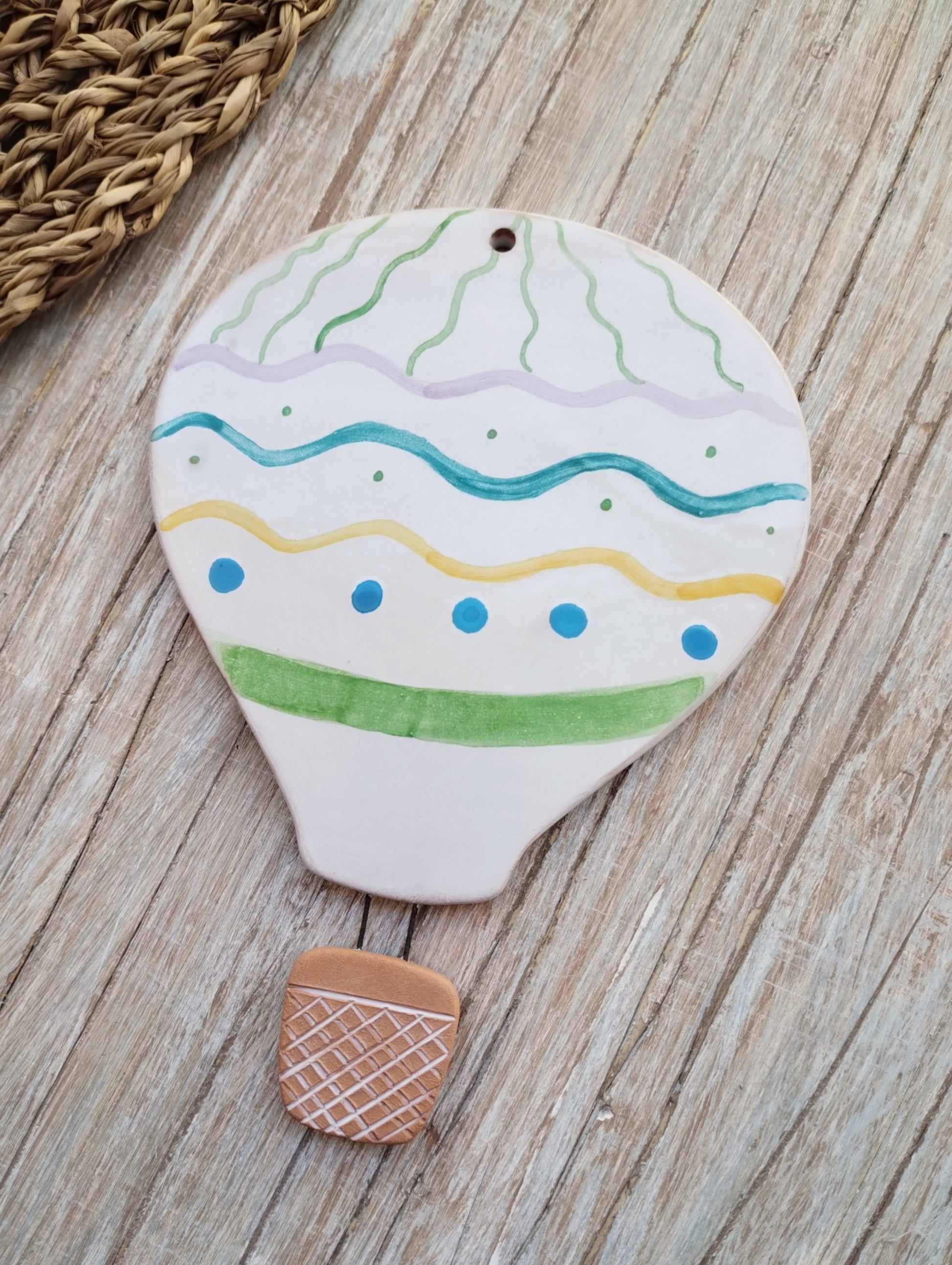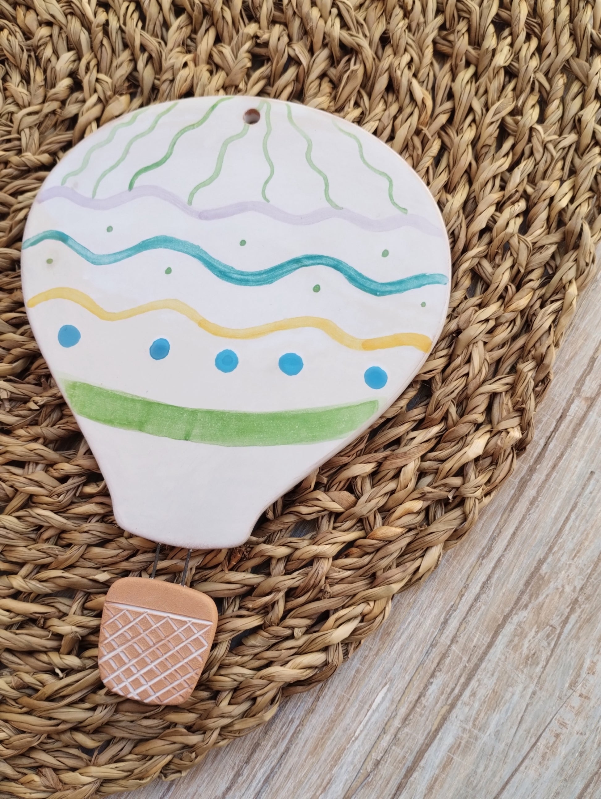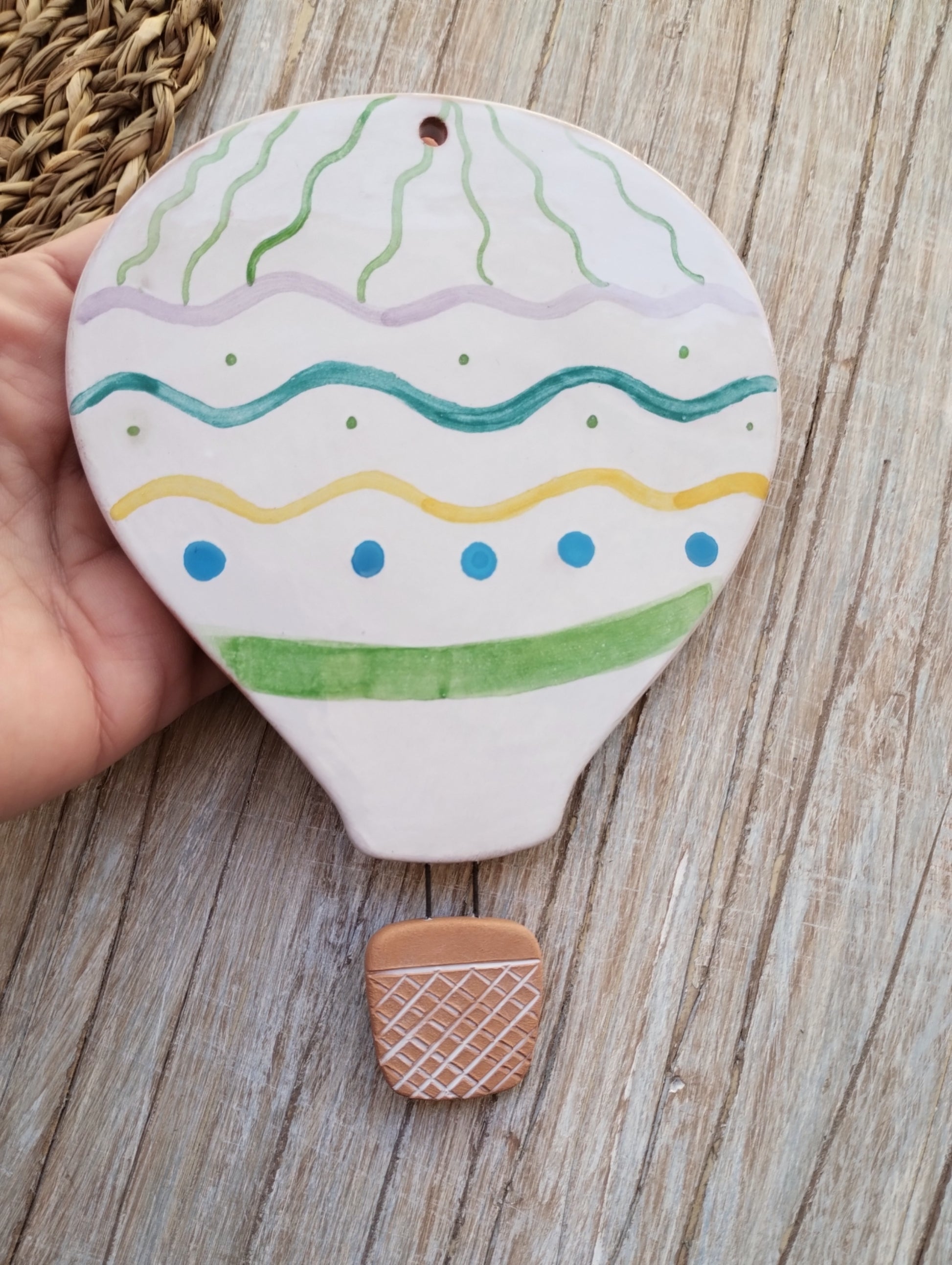 Mongolfiera da parete decorata in maiolica, fornita di foro per essere appesa, ha una dimensione di 15x11.
