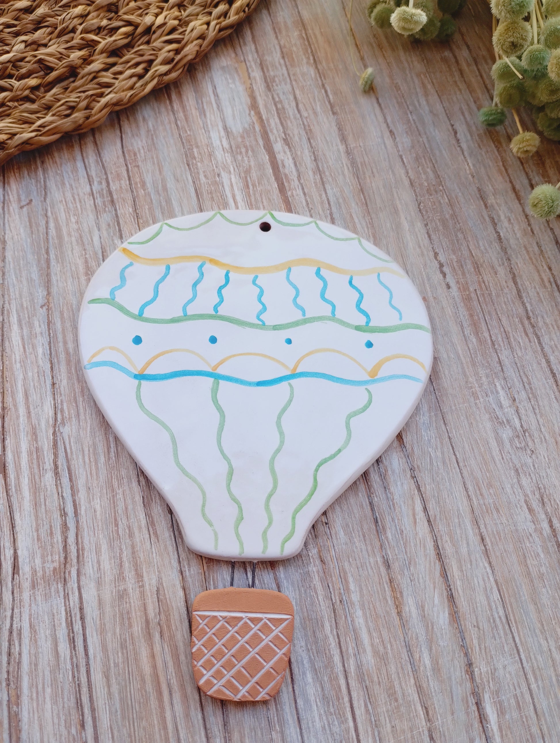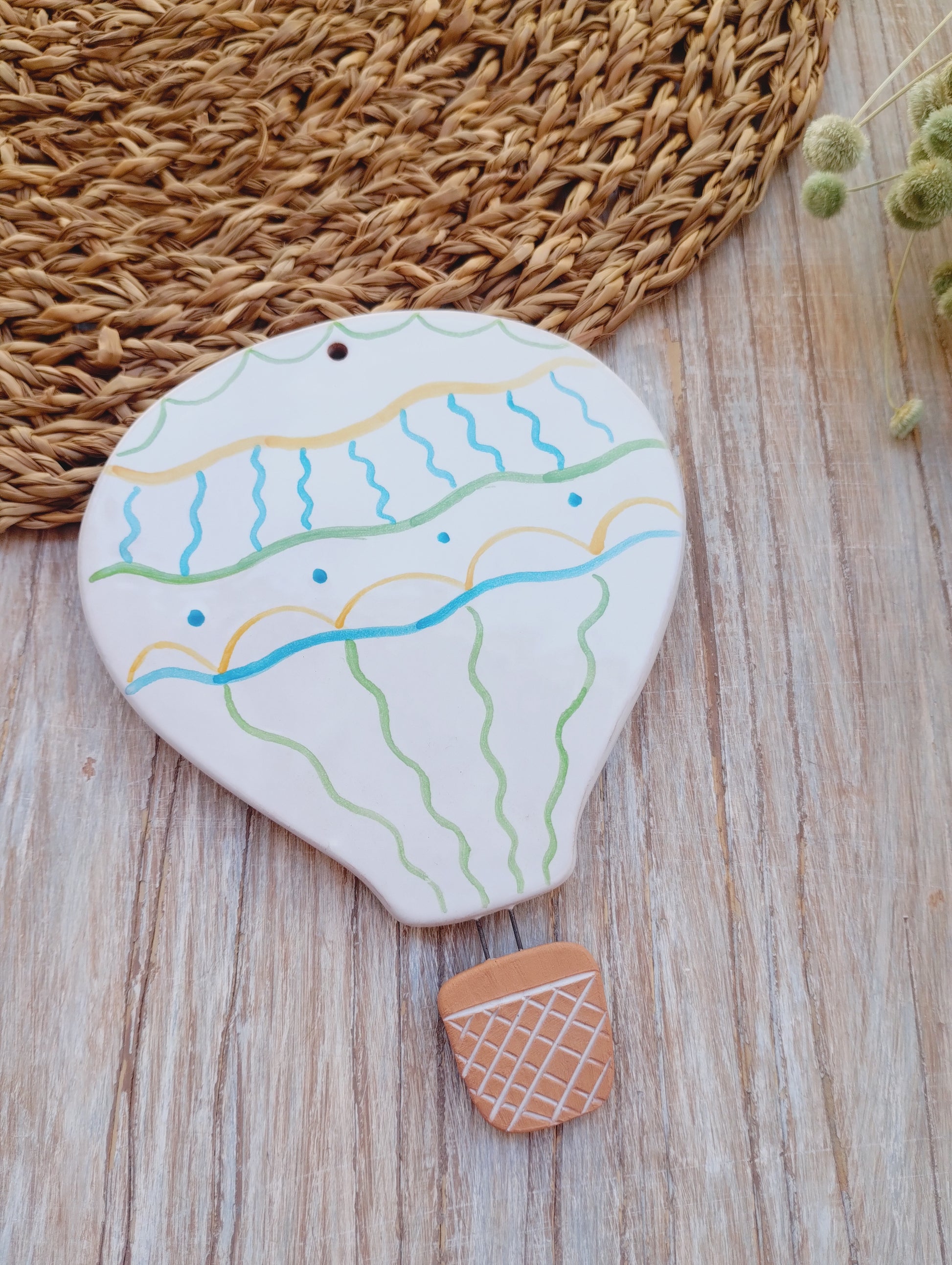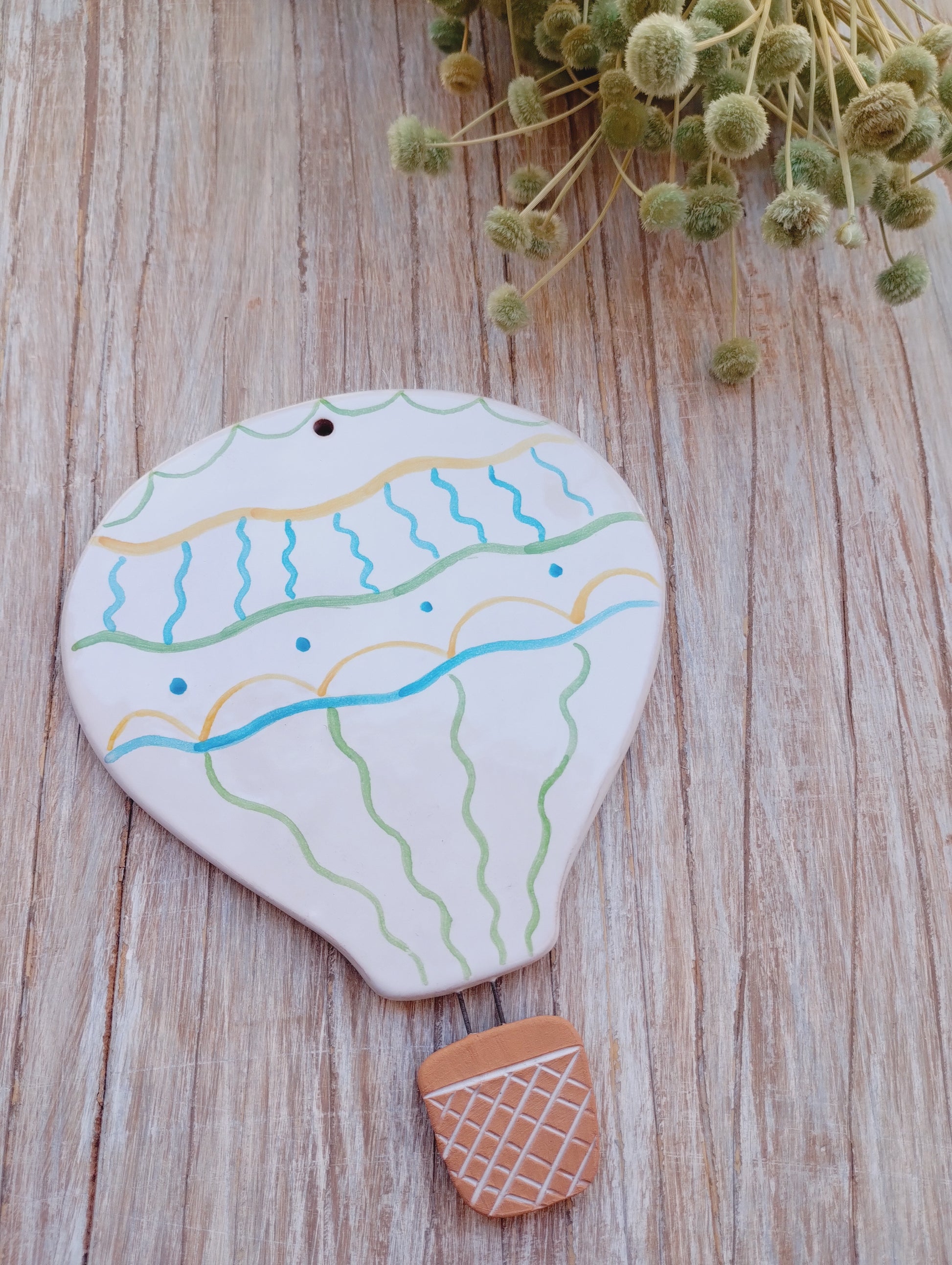 Mongolfiera da parete decorata in maiolica, fornita di foro per essere appesa, ha una dimensione di 15x11.