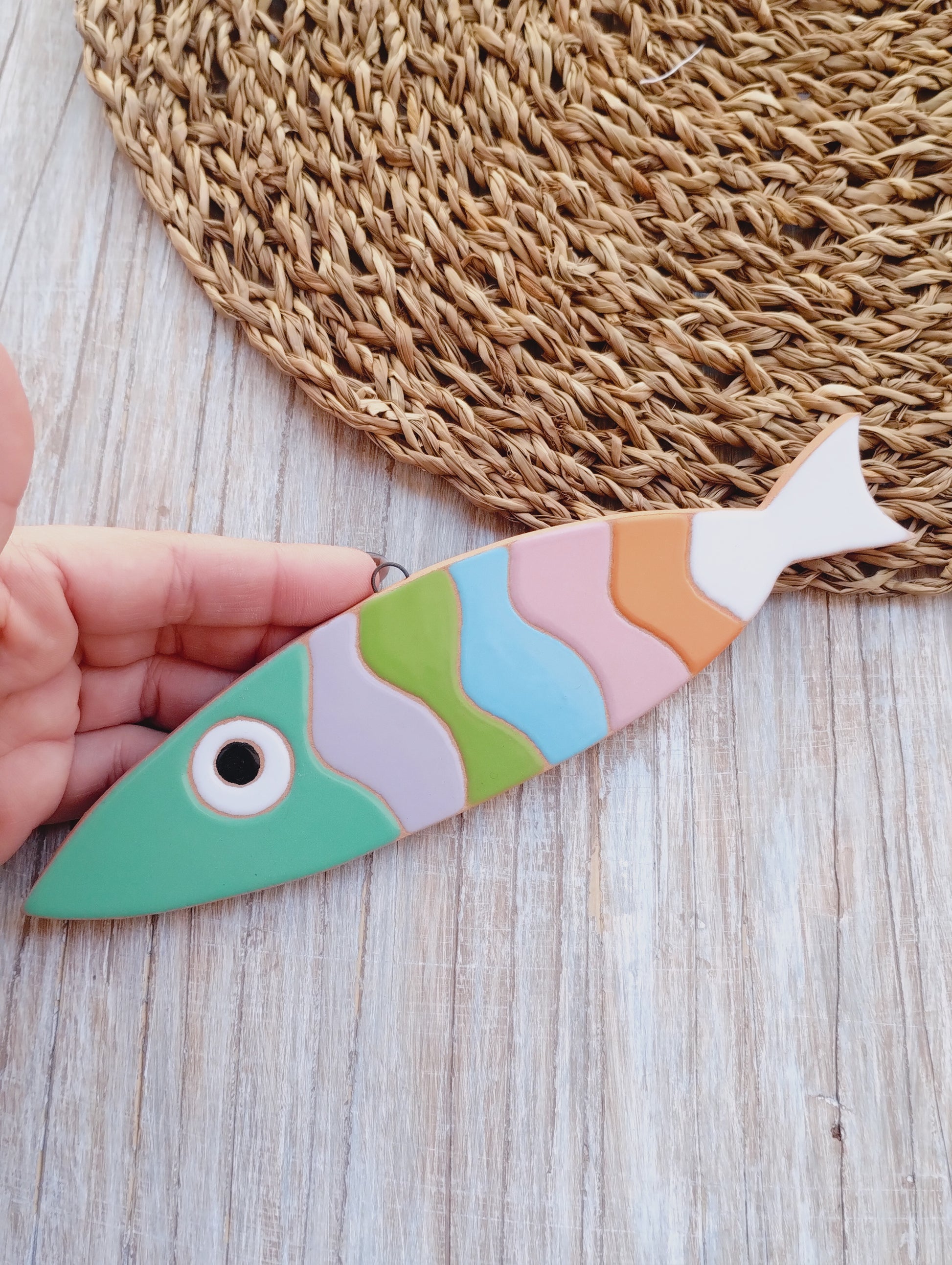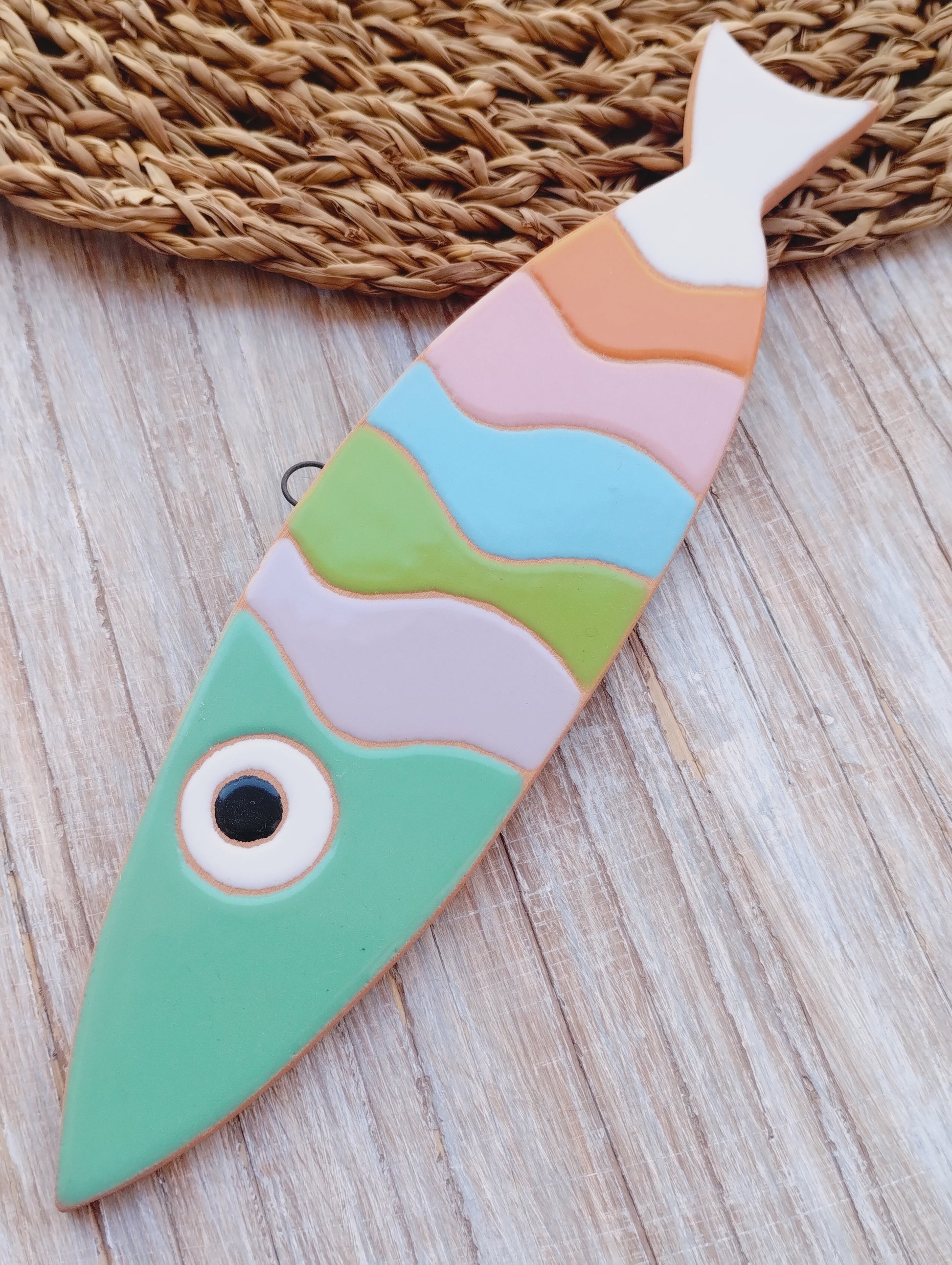 Pesce in ceramica decorato con la tecnica della cuerda seca, è fornito di gancio per essere appeso.