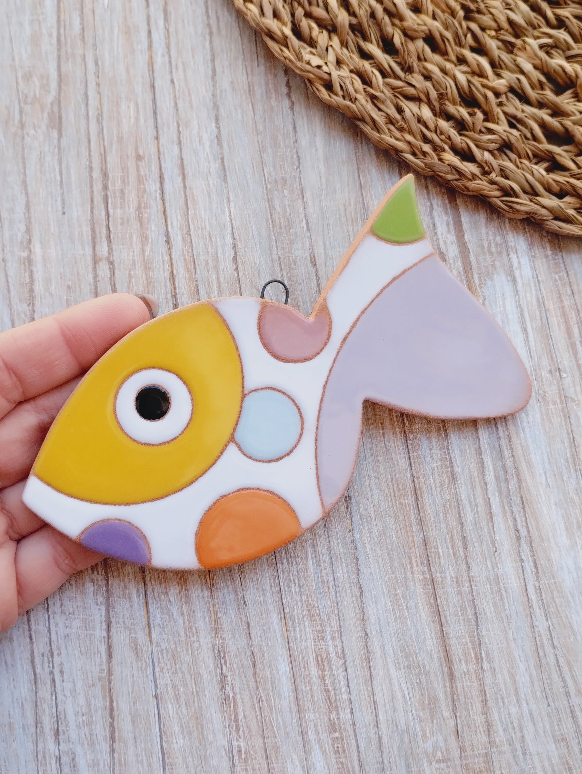 Pesce in ceramica decorato con la tecnica della cuerda seca, è fornito di gancio per essere appeso.