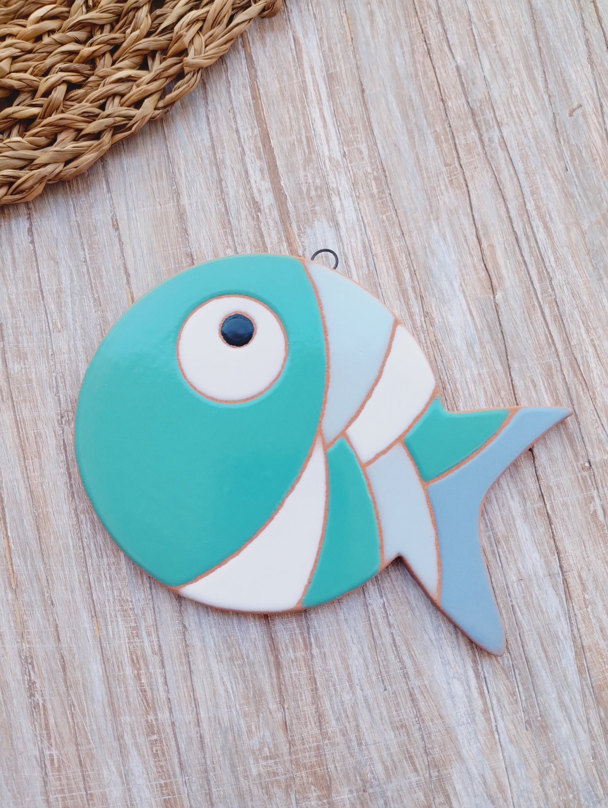 Pesce in ceramica decorato con la tecnica della cuerda seca, è fornito di gancio per essere appeso.