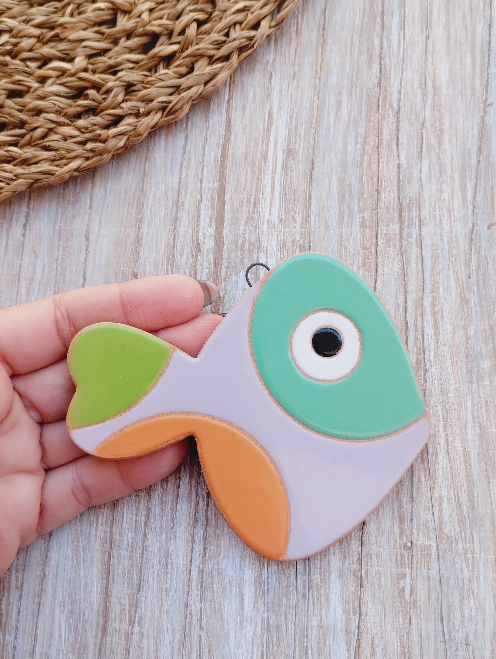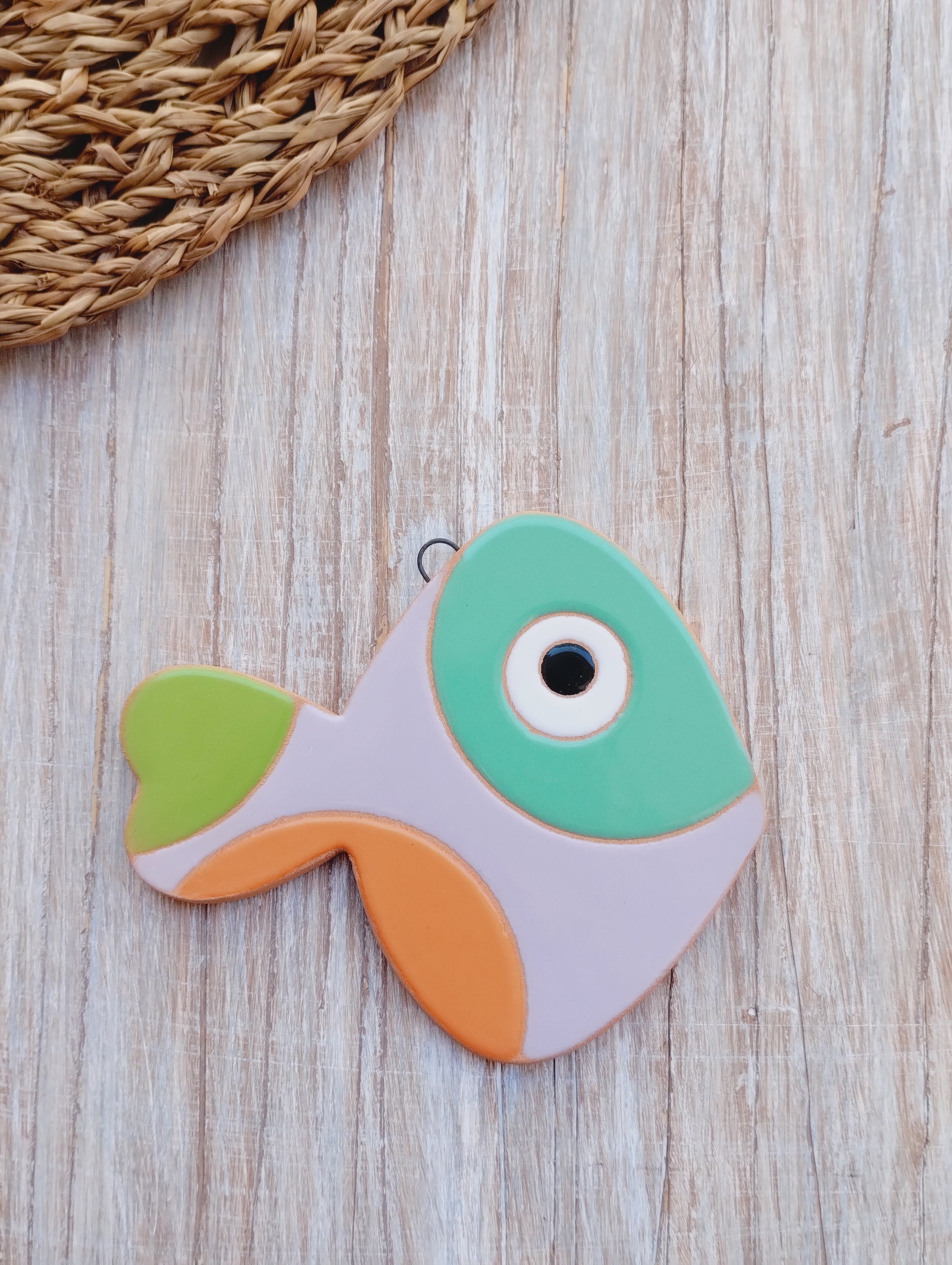 Pesciolino in ceramica decorato con la tecnica della cuerda seca, è fornito di gancio per essere appeso.