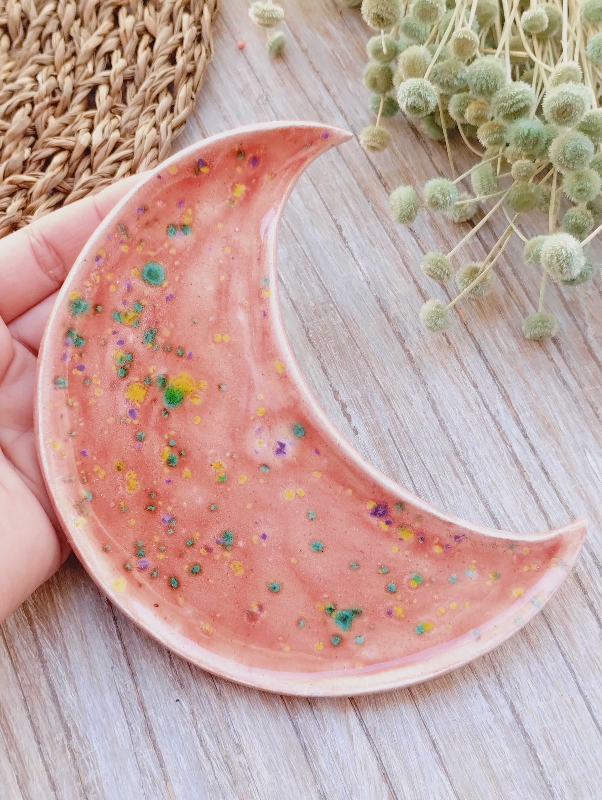 Piattino in ceramica a forma di luna, puoi utilizzarlo come porta bijoux o porta incensi, il retro è grezzo.