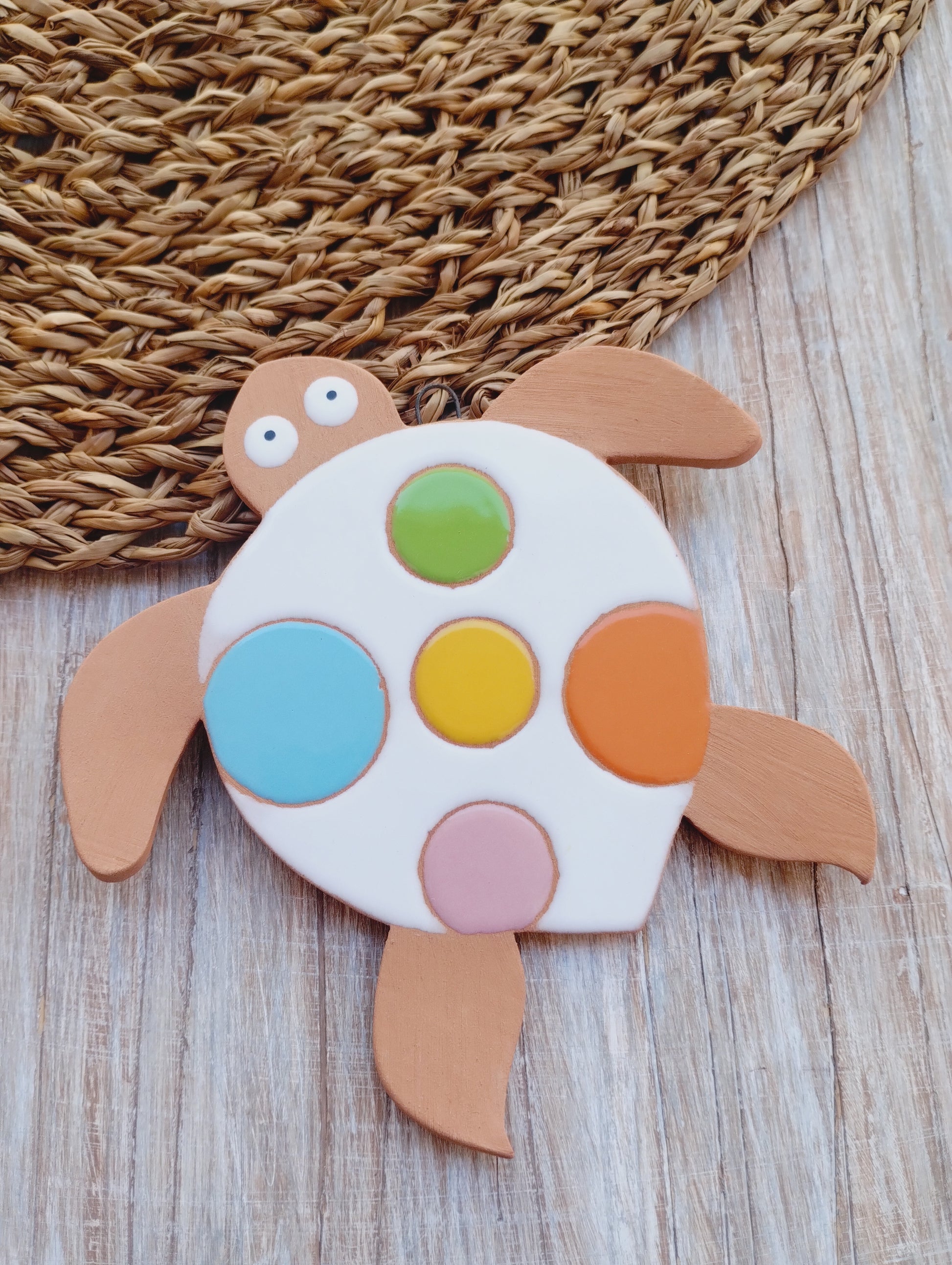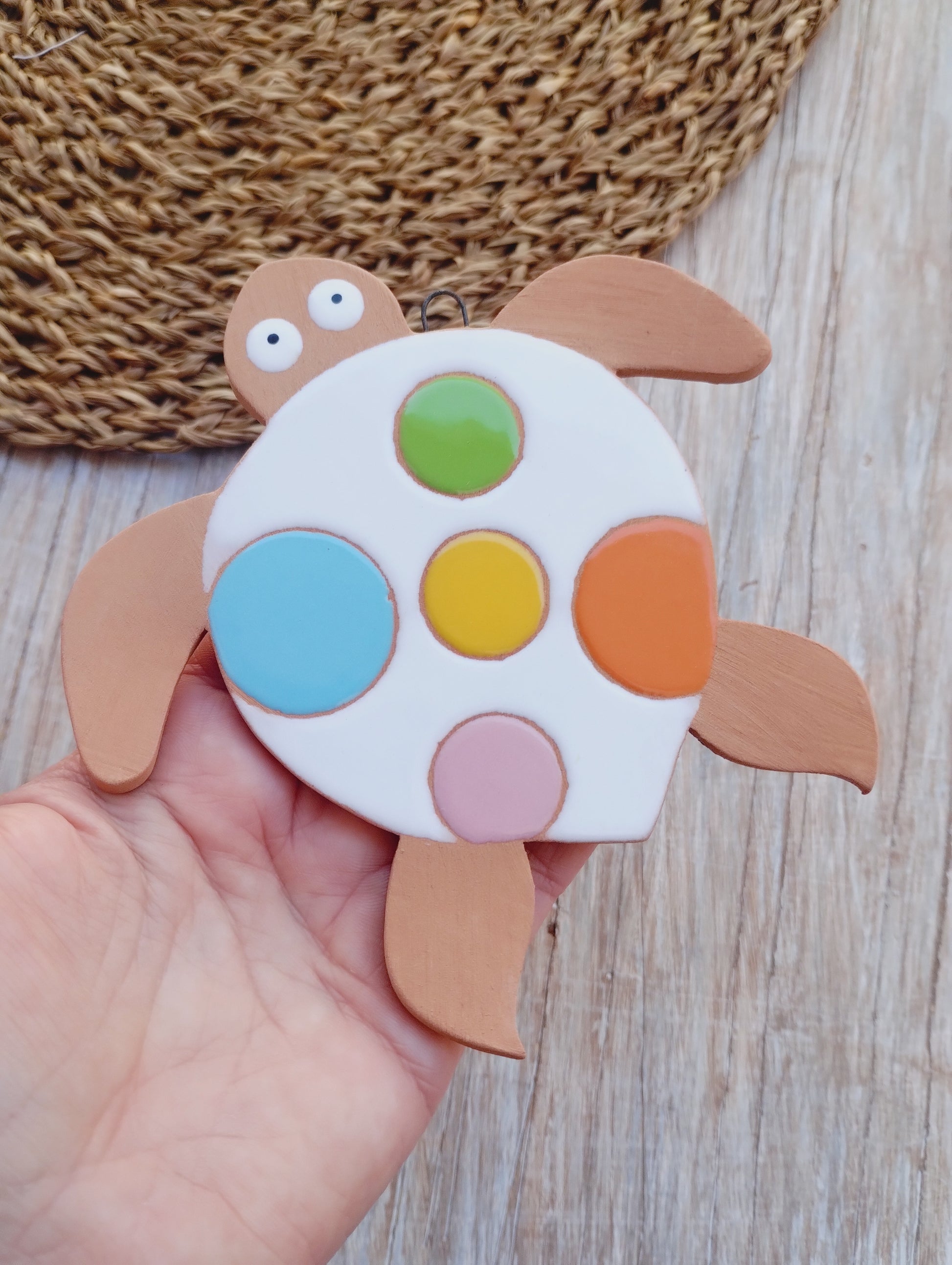 Tartaruga in ceramica realizzata in argilla rossa e decorata con la tecnica della cuerda seca, è fornita di gancio per essere appesa.